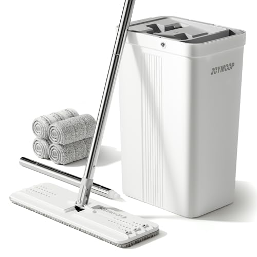 JOYMOOP Mop and Bucket with Wringer Set, White Flat Squeeze Mop Bucket Set for Floor Cleaning, Wet Dry Mop for Wall Cleaner with Long Handle, Hardwood Floor Mop with 4 Microfiber Cloths
