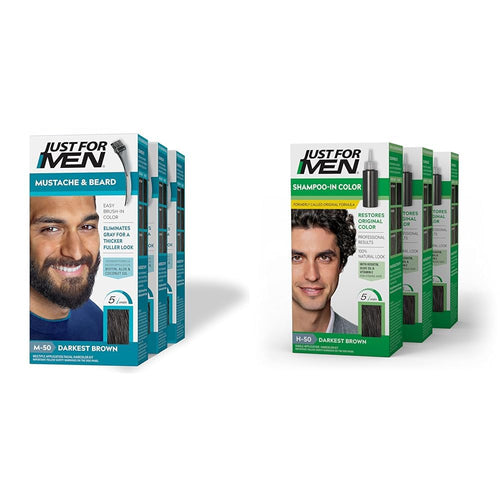 Just For Men Easy Comb-In Color Mens Hair Dye, Easy No Mix Application with Comb Applicator - Dark Brown, A-45, Pack of 3 & Mustache & Beard, Beard Dye for Men with Brush