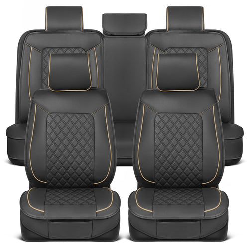 MotorBox Prestige Faux Leather Seat Covers, Semi-Custom Fit Car Seat Covers Full Set, Automotive Interior Cover for Car Truck Van SUV, PU Leather Car Seat Covers for Superior Feel & Durability - Beige
