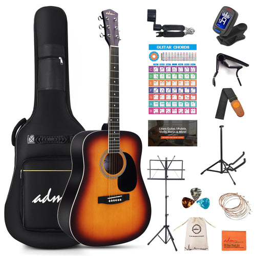 ADM Dreadnought Acoustic Guitar Kit with Free Lesson for Beginner Adult Teen Full Size Acustica Guitarra Starter Bundle Set w/Bag Strap Tuner Capo Pickguard Music Stand Right Hand(Sunburst, 41 Inch)