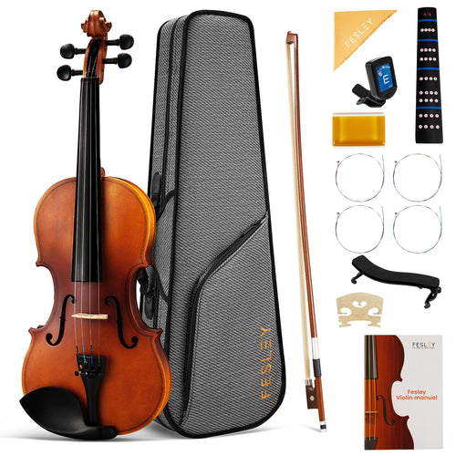 Fesley Violin Fiddle Beginner Set: 1/4 Matt Violin Kit for Student, Acoustic Violin with Hard Case, Solidwood Hand Made Violin Starter Kit with Violin Bow, Rosin, Shoulder Rest, Tuner, Extra Strings
