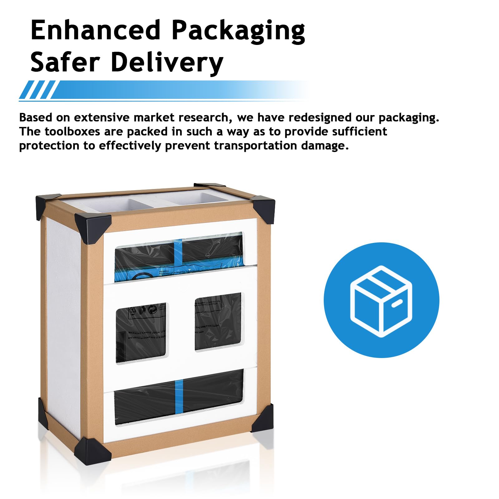 - 【Reinforced Packaging】Based on extensive market research, the toolboxes have been redesigned for packaging. The metal toolbox is wrapped in foam and placed in a packing box for transportation in order to effectively prevent transportation damage and strengthen the packaging to make transportation safer. The assembly of the toolbox is very simple, the main accessories have been installed, only need to install some matching handrails and wheels.