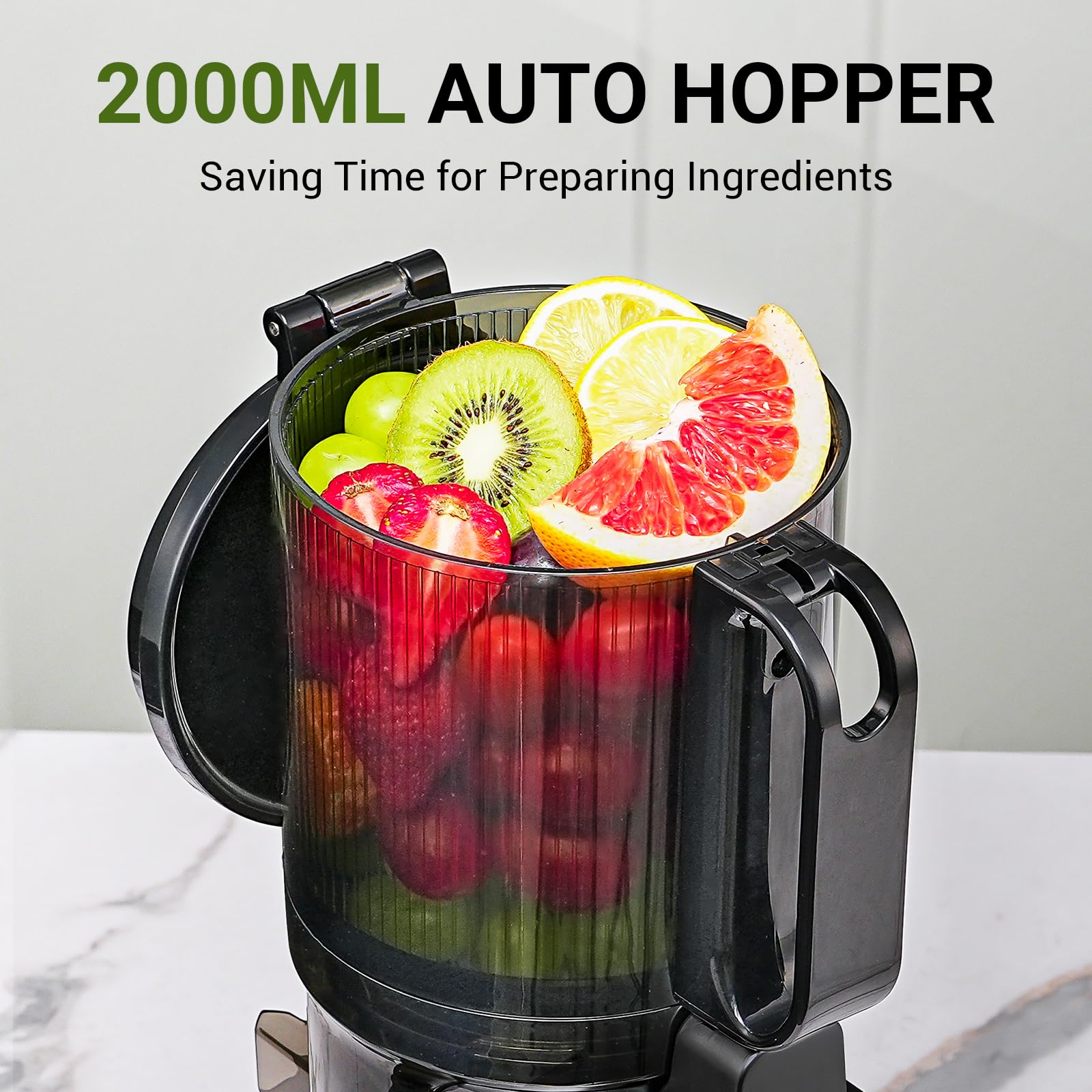 - [5.3-Inch Wide Feed Chute]: The 5.3-inch feed chute accommodates whole fruits and vegetables, eliminating the need for pre-cutting. With a smart safety lock, the juicer automatically stops if the lid is opened, ensuring your family’s safety.