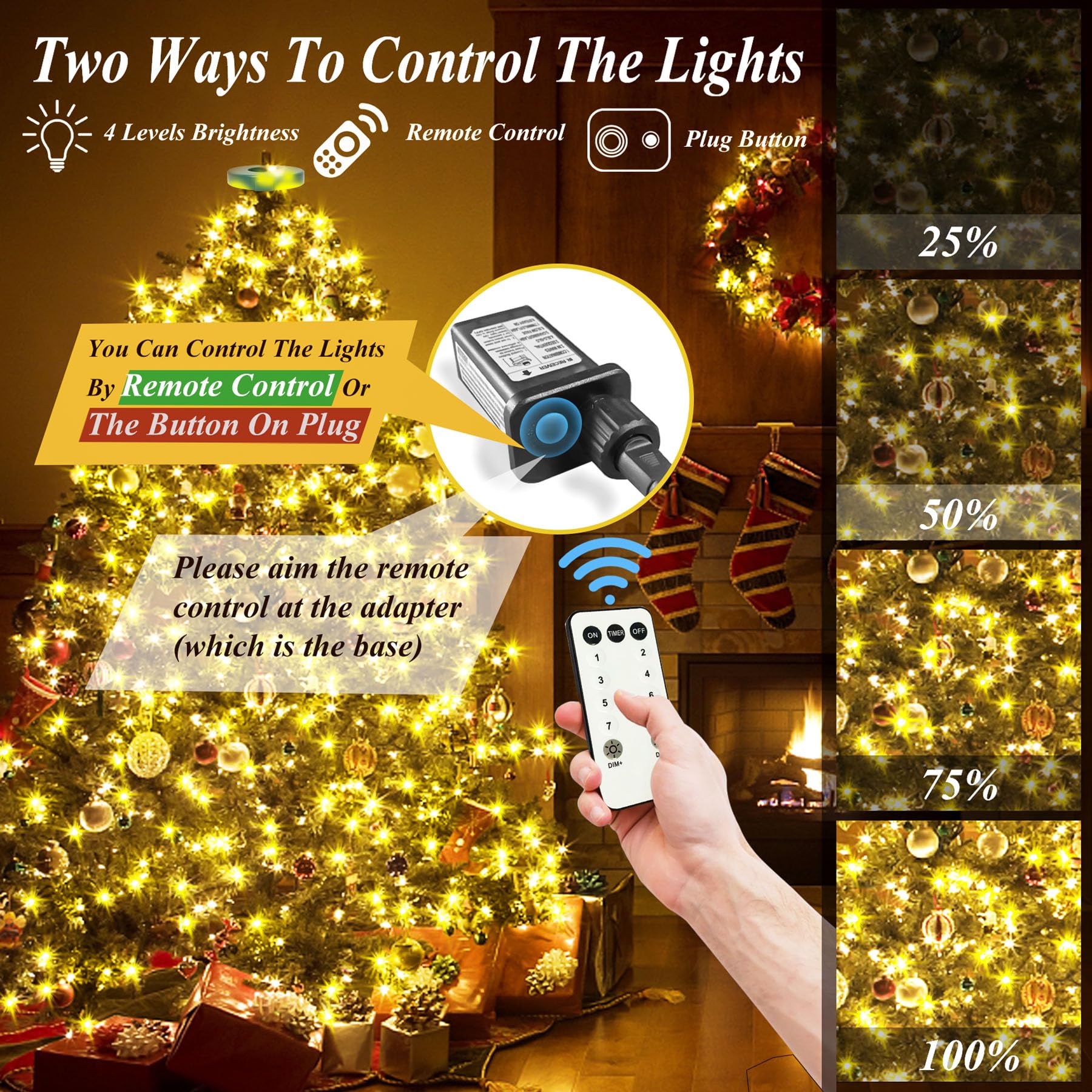 - 🎄【8 Lighting Modes & 4 Levels Brightness】aneeway Christmas tree lights are available in 8 different lighting modes(Use remote control or press the button on the plug to switch the light modes). And the string lights have 4 levels of brightness (25%, 50%, 75%, 100%) for choice. A variety of blinking modes and brightness bring different light effects, which will make your Christmas tree and holiday more atmospheric!