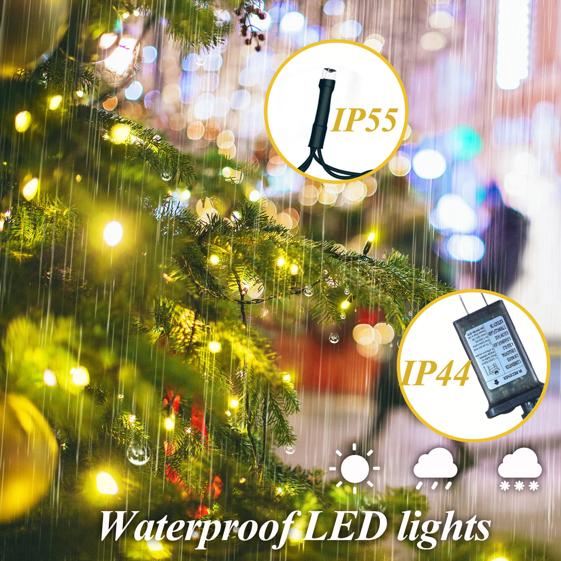 - ☔【Waterproof LED lights】The Christmas LED string lights are made of waterproof material(IP55 waterproof LED light strings & IP44 waterproof adapter), which can withstand light rain and water splashes, also work well in snowy weather. Perfect for outdoor and indoor Christmas decorations, party, holiday, wedding and garden, yard, patio decorations.