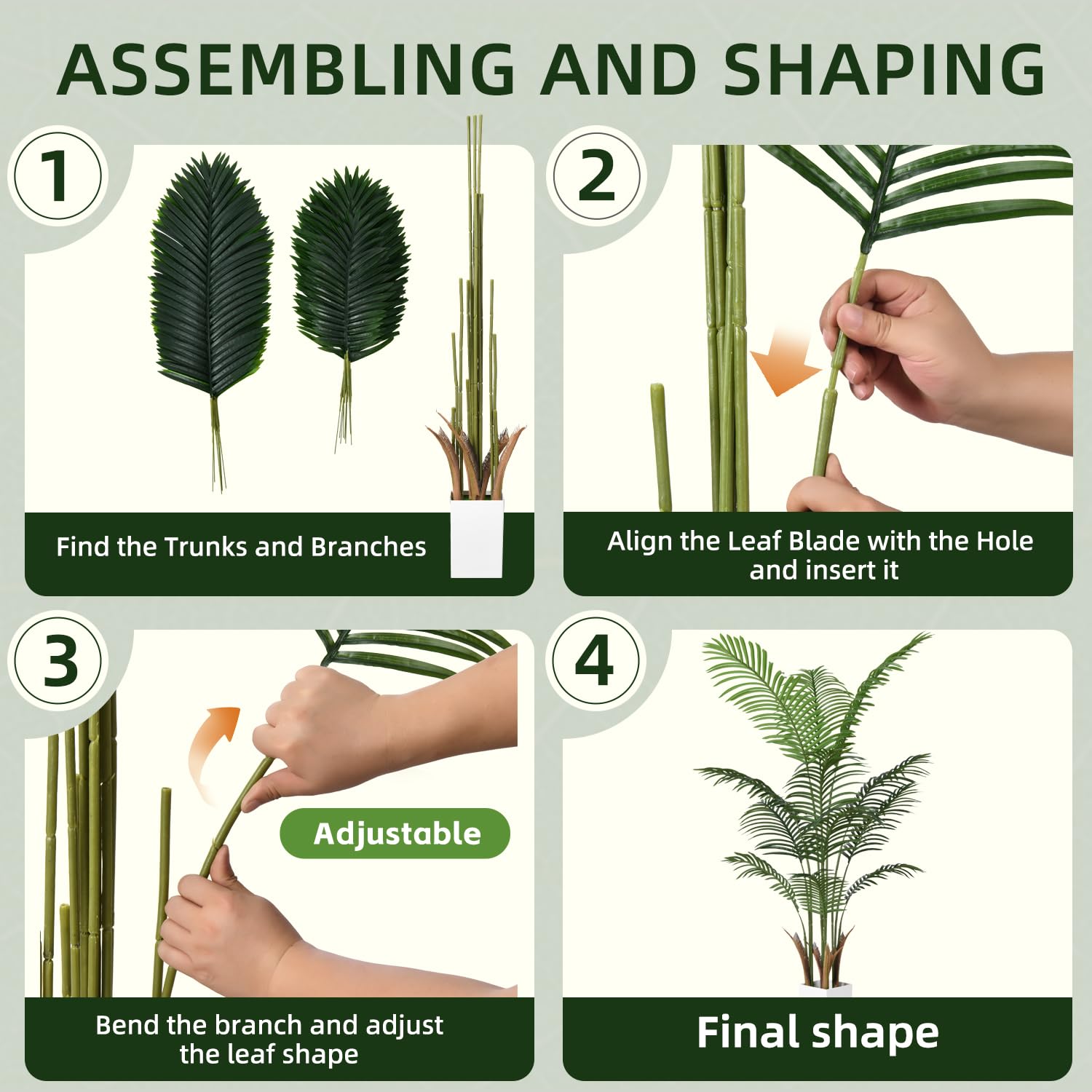 - 【Four Size Artificial Palm Tree】There are 4ft、5ft 、6ftand 7ft fake palm tree for you to choose,the 4 ft has 9 realistic leaves ,the 5 ft has 12 realistic leaves, and the 6ft has 15 realistic leaves. after you receive, you need to simple assembly, Faux Palm tree have strong internal metal wires, so you can adjust the trunk to the shape as you like without worrying about the trunk breaking.