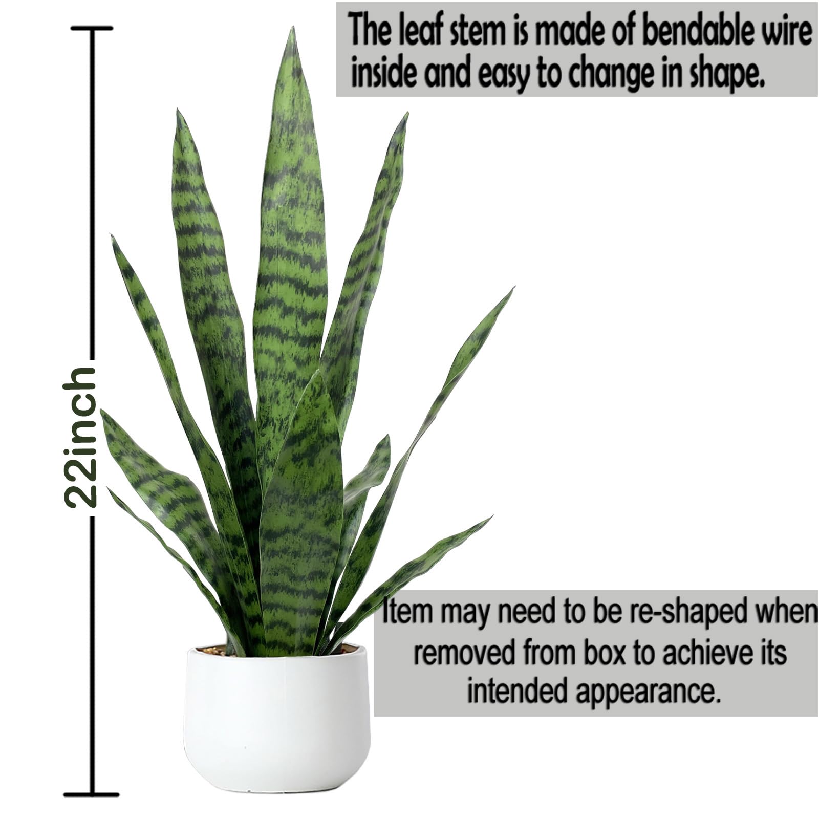 - Artificial Sansevieria Potted Plant Dimensions: 22.5"H X 10"W; Planter:4.2"W X 3.5"H. Material is made up of plastic.