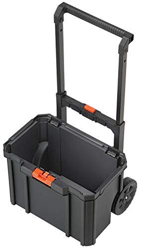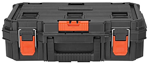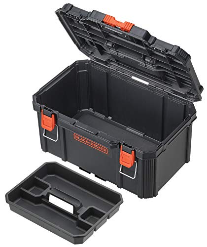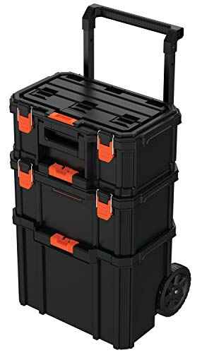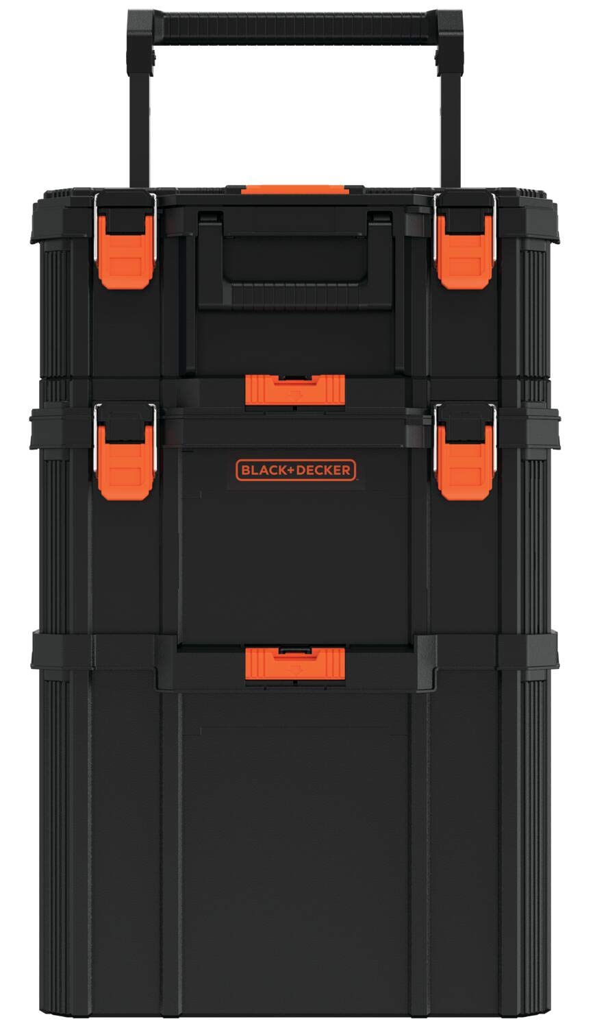 Details: This BLACK+DECKER Stackable Storage System is a 3-in-1 portable storage solution, which separates into 3 toolboxes in a matter of seconds. It includes an extra-large rolling tote for safe and convenient storage of power tools and bulkier items, a deep toolbox with removable tote tray ideal for storing hand tools, and a shallow toolbox for small parts and accessories. Each toolbox features an auto-lock front stacking latch for quick and easy connecting/releasing. Grab the piece you need for your project in the basement or effortlessly take the entire unit with you out to fix up the treehouse thanks to the telescoping handle and wheels.
