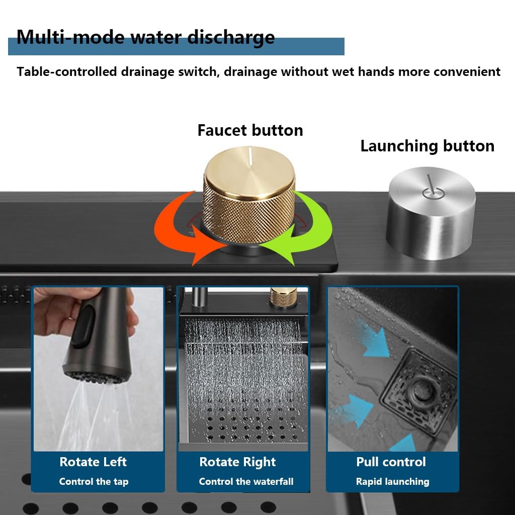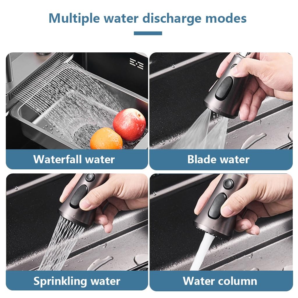 - 【PACKAGE DETAILS】- Sink*1, Sewer filter*1, Drain basket*1, Angle valve*2, Clean water faucet*1, Waterfall pull faucet*1, Console drainage pipe*1, Water inlet pipe*2, Glass Rinser*1, Cutting board*1,Nano stainless steel small sink*1.