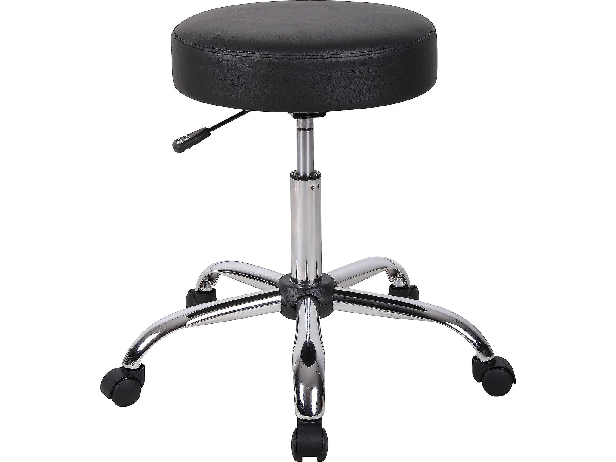 Details: Made with a shiny chrome finish on the base and a sleek black vinyl upholstery on the seat, the Boss Black Caressoft Medical Stool makes an attractive addition to any office. Cleaning the fabric is a cinch and with an ergonomic design, users won't have to worry about their backs becoming stressed. The unit measures 24" W x 24" D x 20.5-26.5" H with the vertical height range of 6". The dual wheel casters allow for seamless movement around the room and the seat itself has a capacity of 275 pounds. This model may be purchased with a back cushion if needed.