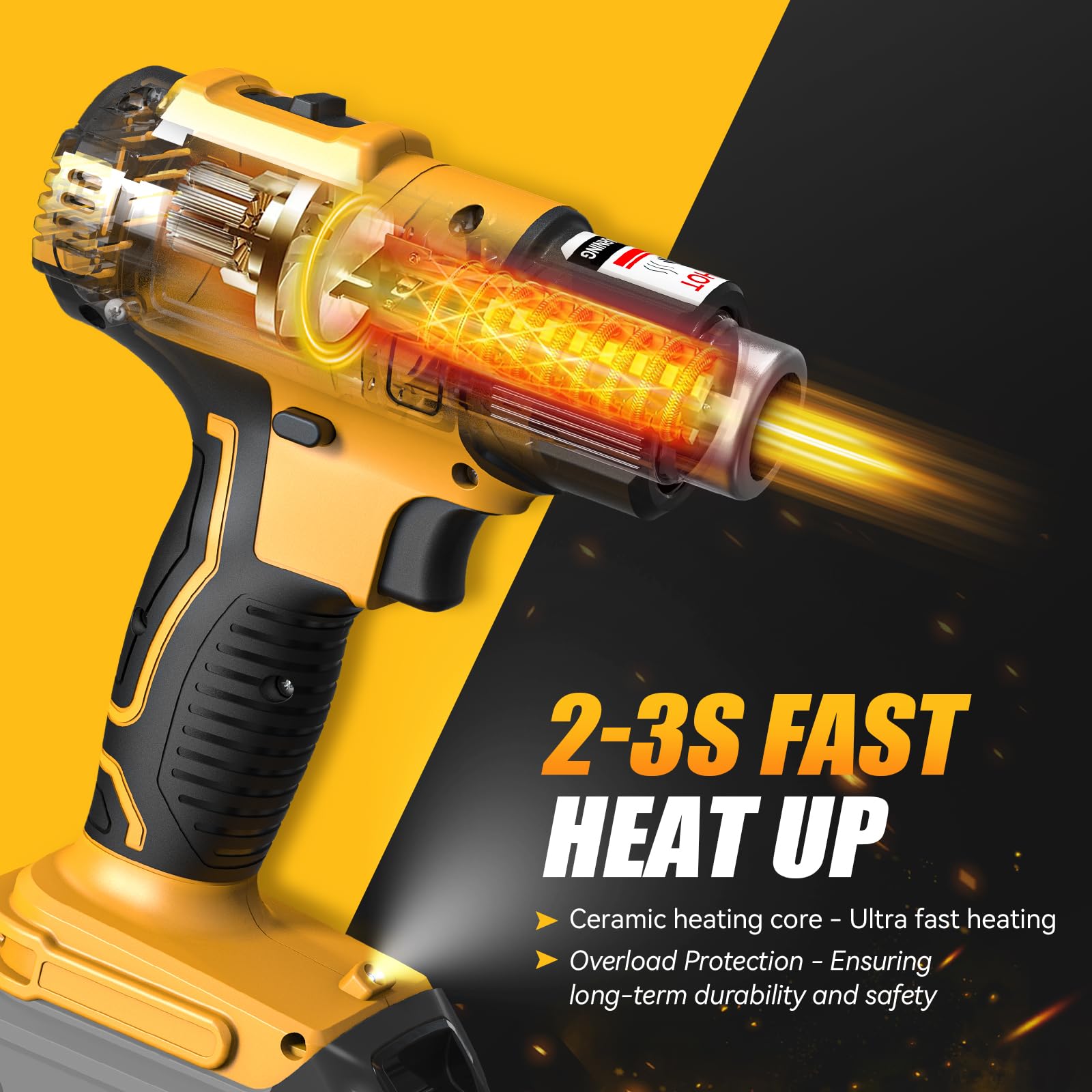 - 【Efficient Heating】——The cordless heat shrink gun for dewalt 20v batteries is a highly efficient tool that quickly heats up to its maximum temperature in 2-3 seconds. Its powerful motor generates heat up to 1022 degrees Fahrenheit, making it ideal for a wide range of applications such as heat shrinking, paint stripping, and thawing frozen pipes.