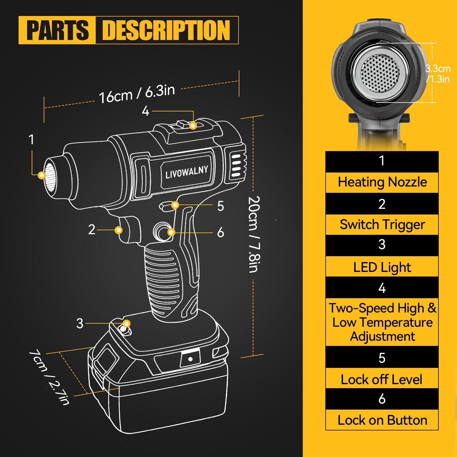 - 【Friendly reminder】—— 1. This heating gun does not include any batteries, it is just a bare tool. 2. If it is not in use, remove the cordless heat gun from your battery, or it will drain the battery. 3. For optimal performance and longer usage, use a battery with at least 4.0ah, as this is a high-power tool. 4. Exercise caution to avoid burns while using the heat shrink gun.