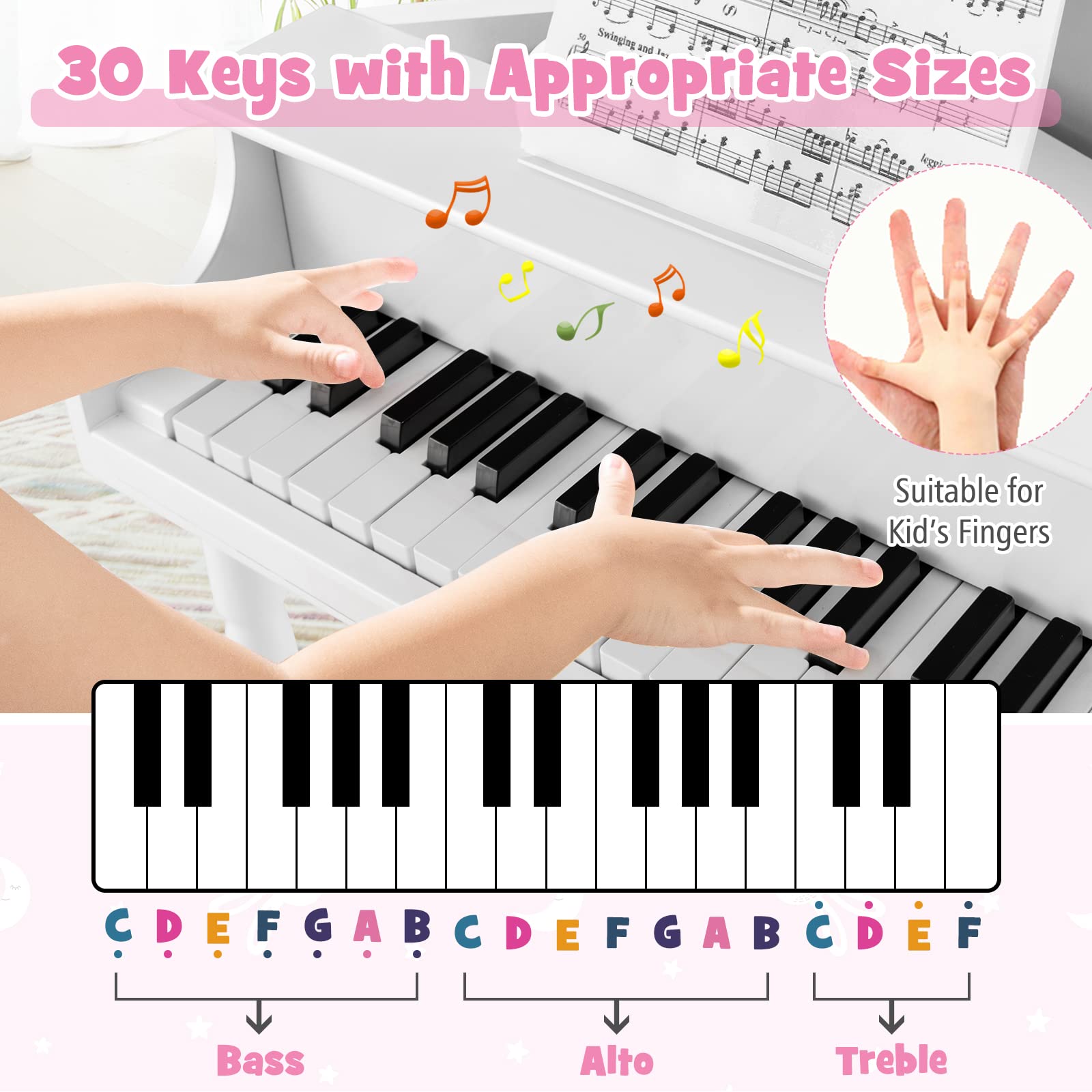 - Exquisite Children Piano: Our children piano with 30 keys has exquisite workmanship. Classical and elegant appearance as well as pleasant sound can fully attract children's attention. The piano is equipped with the music stand and bench, giving you a complete set of accessories. It is suitable for children from 3-8 years old.