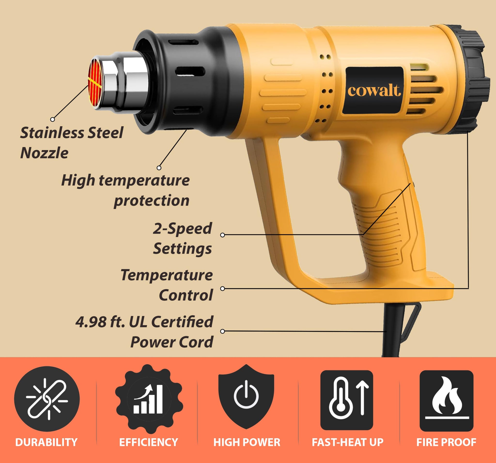 - Efficient Heating & Energy Saving With advanced technology, Cowalt heat gun offers efficient heating while consuming minimal energy. Save time and money on your projects with our energy-efficient heat gun