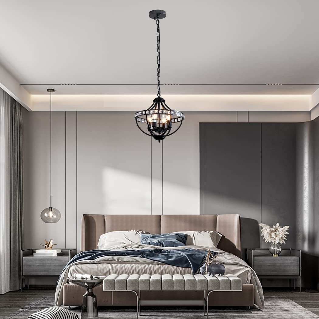 - ☀ Crystal Chandelier: This 4-Light black crystal chandelier is made of iron artisanal finish, features crystal tube is shiny, crystal home decor. It's the focal point of your home renovation, you'll absolutely fall in love with it.features crystal tube is shiny, crystal home decor.