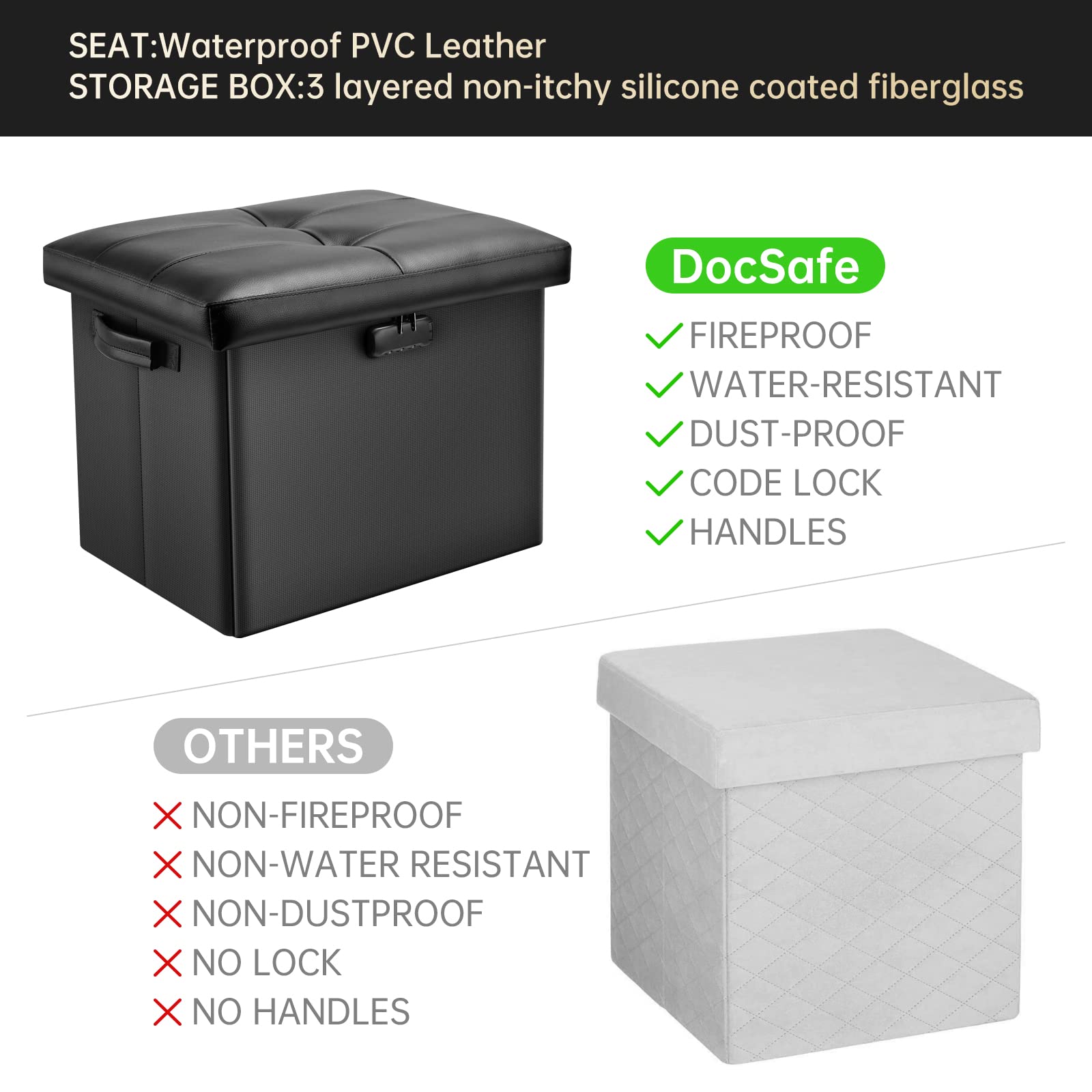 - Fireproof and Water-resistant(17"X13"X13"): Compared with other storage ottoman, our fireproof storage ottoman is made of 3 layered non-itchy silicone coated fiberglass which stands up the temperature up to 2000℉. The Storage Chest is fireproof and waterproof,which can effectively protect your important files in a fire and wet weather. They will further keep your files intact. It has been passed by SGS TEST(UL94 Certified) for a longer life and can be used with peace of mind.