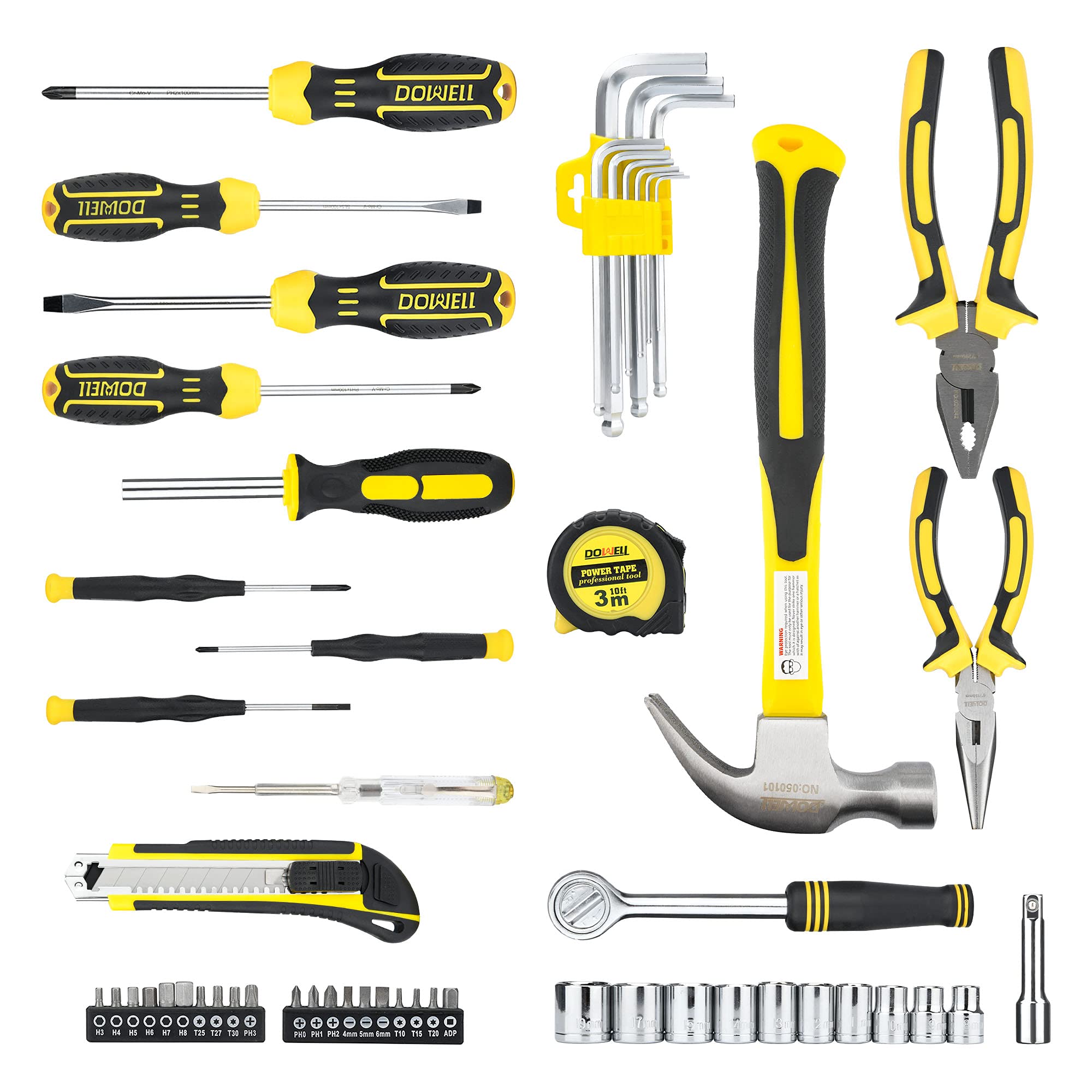 - EASY TO CARRY & STORAGE:This tool kit comes with a sturdy blow-molded case for easy storage and portability. Sturdy interior and organizers of this tool box keep tools in place, neat and safe. Put the side with ''DOWELL'' up when opening the toolbox to prevent the tools falling out from the box.