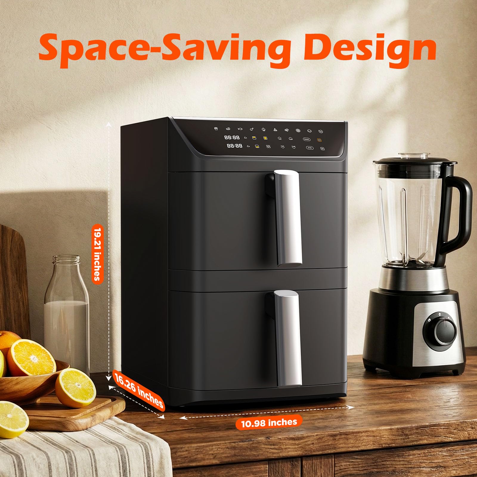 - ๐งบใ๐๐ฎ๐๐ฅ ๐๐๐ฌ๐ค๐๐ญ๐ฌ โ ๐๐จ๐จ๐ค ๐๐ฐ๐จ ๐๐ข๐ฌ๐ก๐๐ฌ ๐๐ญ ๐๐ง๐๐ใThe top-and-bottom dual basket design lets you cook two different foods at the same time, reducing overall cooking time while delivering consistent, even results. Each basket is large enough to fit a whole 6LB chicken, with separate baskets helping keep flavors from mixing.