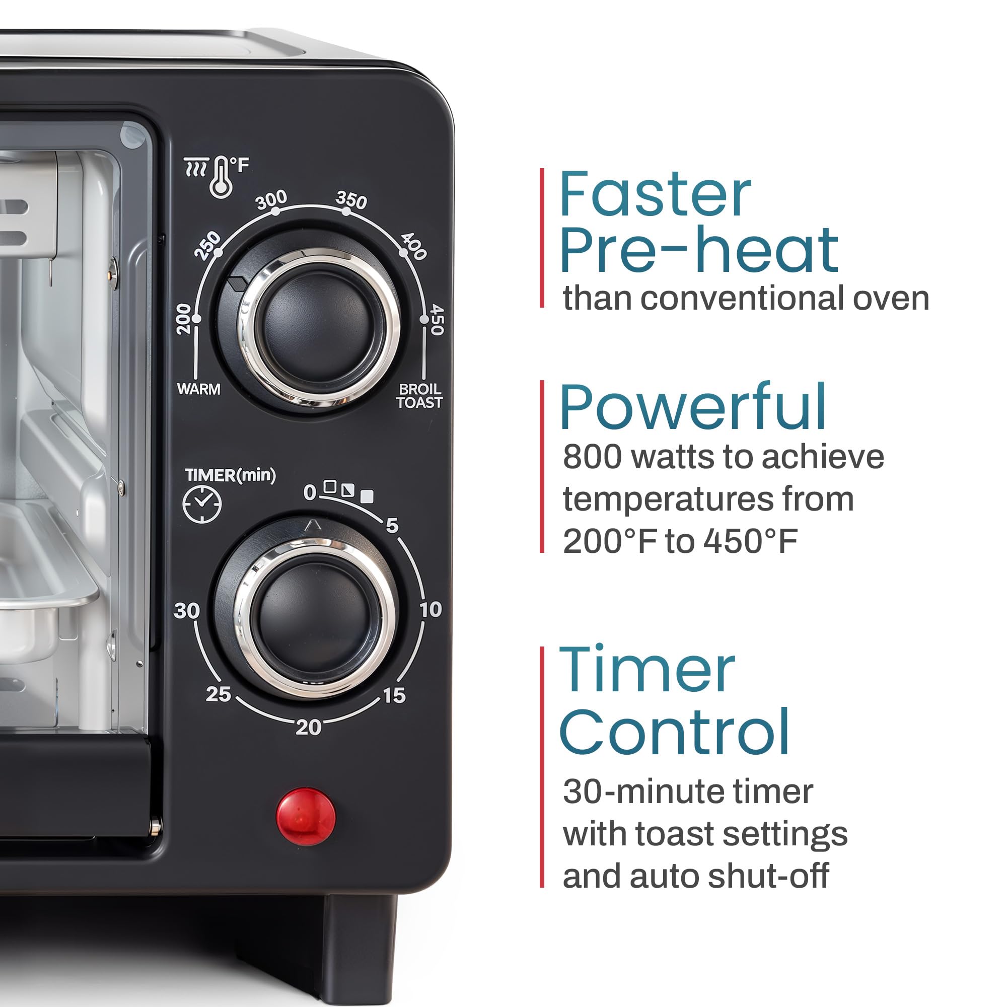 - 800 WATTS OF POWER: Built-in thermostat maintains consistent heating for even cooking and perfect results when baking, roasting, toasting or keeping foods warm.