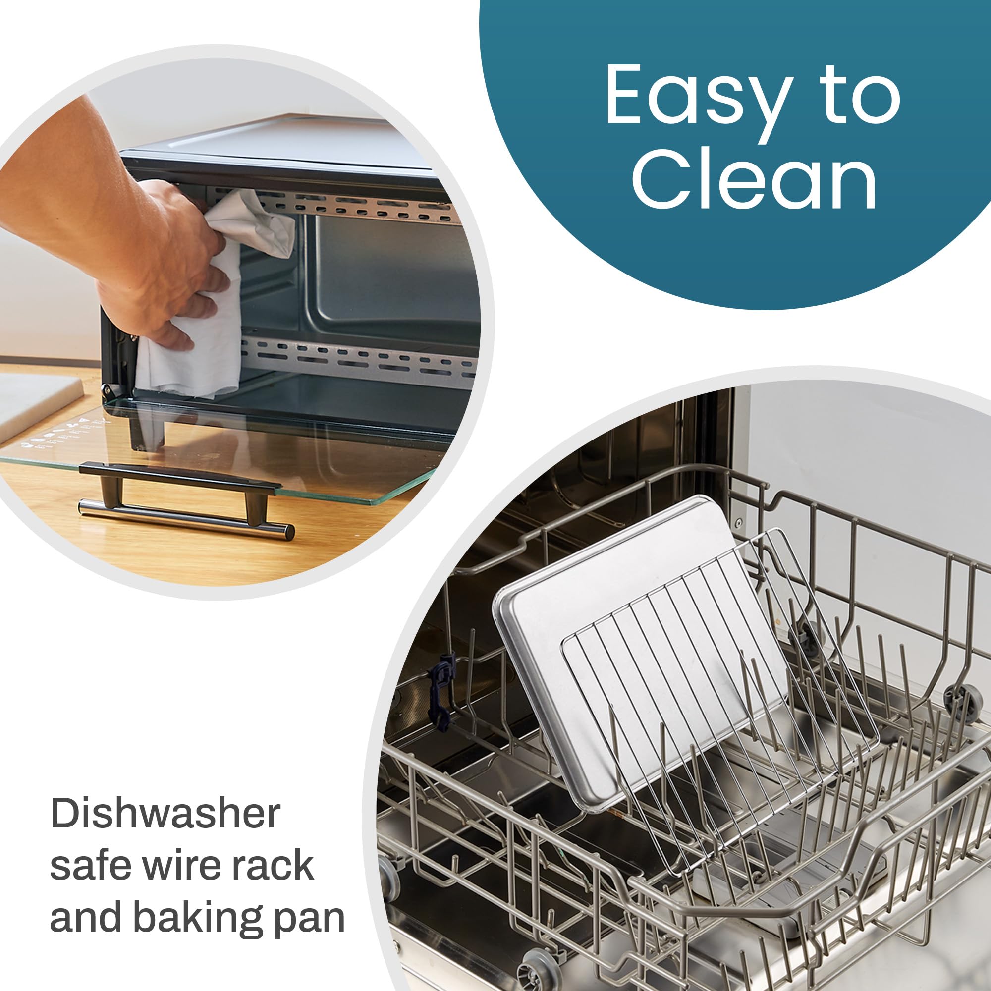 - ACCESSORIES INCLUDED - Includes an easy to clean baking pan and a wire rack that easily slide in and out of the two-rack positions to accommodate a variety of foods.