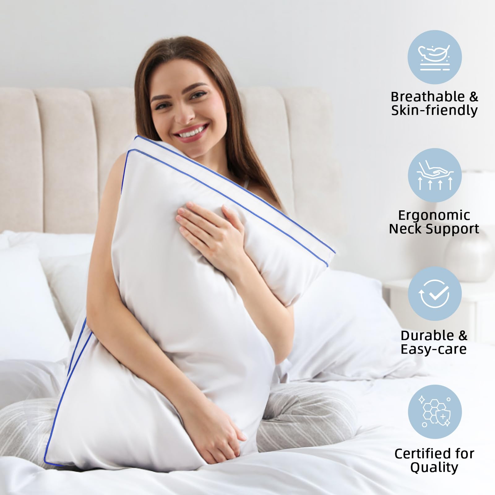 - Certified for Quality and Safety: The pillows have the OEKO-TEX Standard 100 certification. Rest assured with our pillow’s high-quality certification, meeting rigorous safety and environmental standards, and free from harmful chemicals for a healthy sleep environment