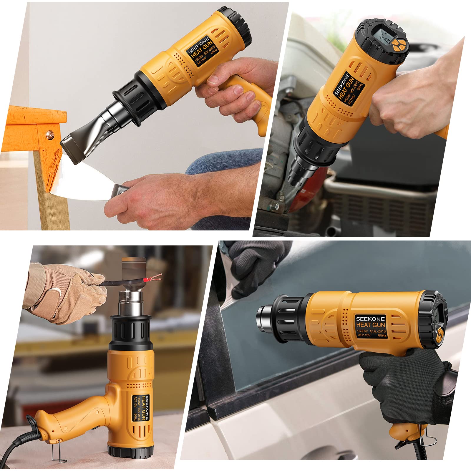 Details: Why Choose SEEKONE Industrial Heat Gun with Display? - We selected high technology to improve the quality of the hot air gun, which is better than most similar products in the market. - Our brand has registered in America, and the core purpose of our company is best quality and user-first,so don’t worry to purchase the product. Makes the work and life convenient and efficient! --The heat gun with a LCD display can adjust the temperature and wind speed through the button which improve the work efficiency quickly. --The hot air gun can be up to 1100℉(600℃) in 3-5 seconds, it will decrease the time of waiting and improve the efficiency to work. Features of Industrial Heat Gun: --The heat gun with a LCD display can show the specific temperature and wind speed, and be able to adjust the temperature and wind speed through the buttons to meet your different needs. --Power-on memory function indicates that when turns on it, the heat gun can directly show the original temperature you setting before and you do not need to set the temperature again. --Power-off delay function shows that the hot air gun may turn off automatically after 15 seconds to protect the hot air gun with a long using life. --It is different with other heat gun, our two file switch design both can adjust the temperature, includes the first file adjustment from 120℉ to 750℉ and the second file adjustment from 120℉to 1100℉ . --℃ Change to ℉:Press the 2 wind speed button in same time for few seconds to set the conversion between Celsius and Fahrenheit