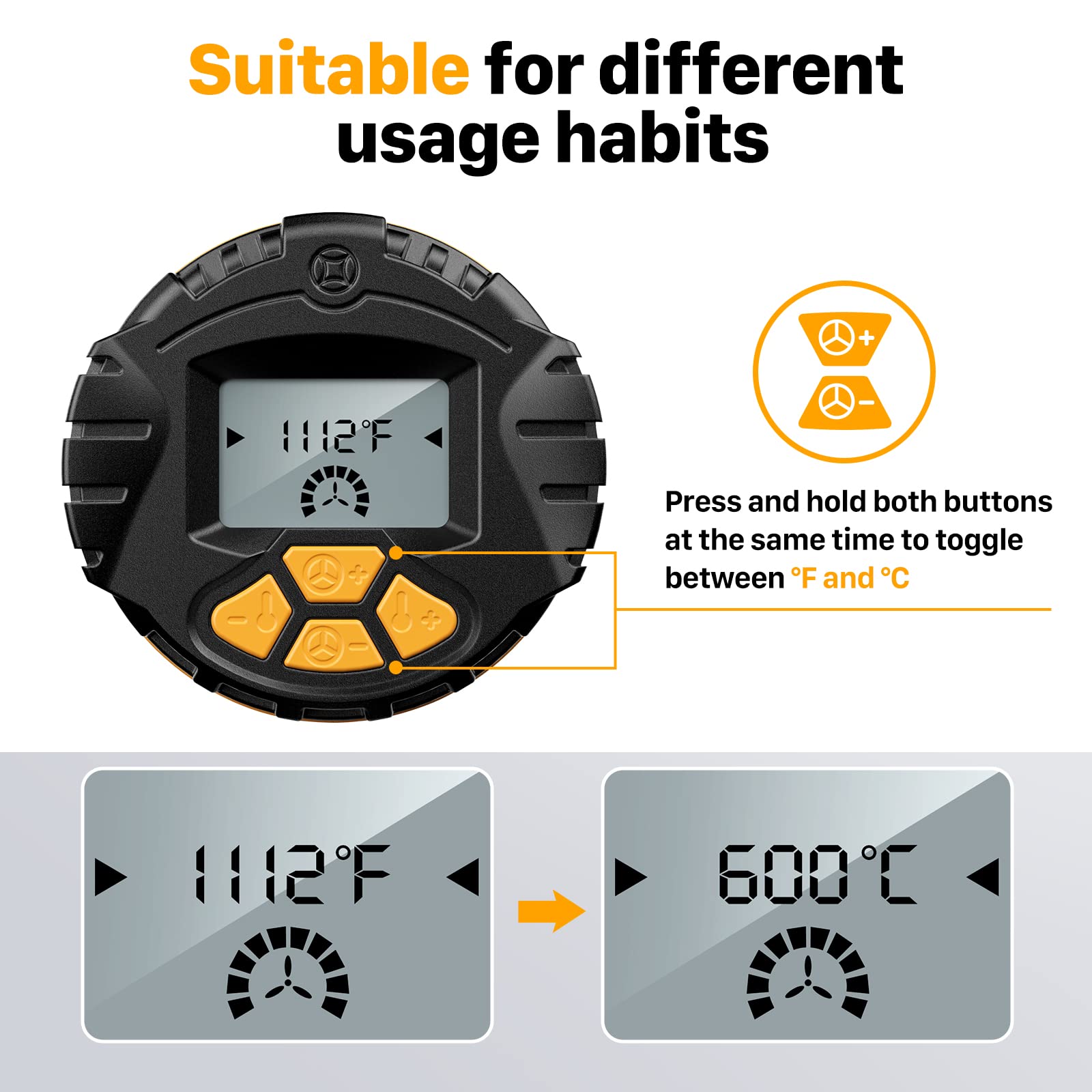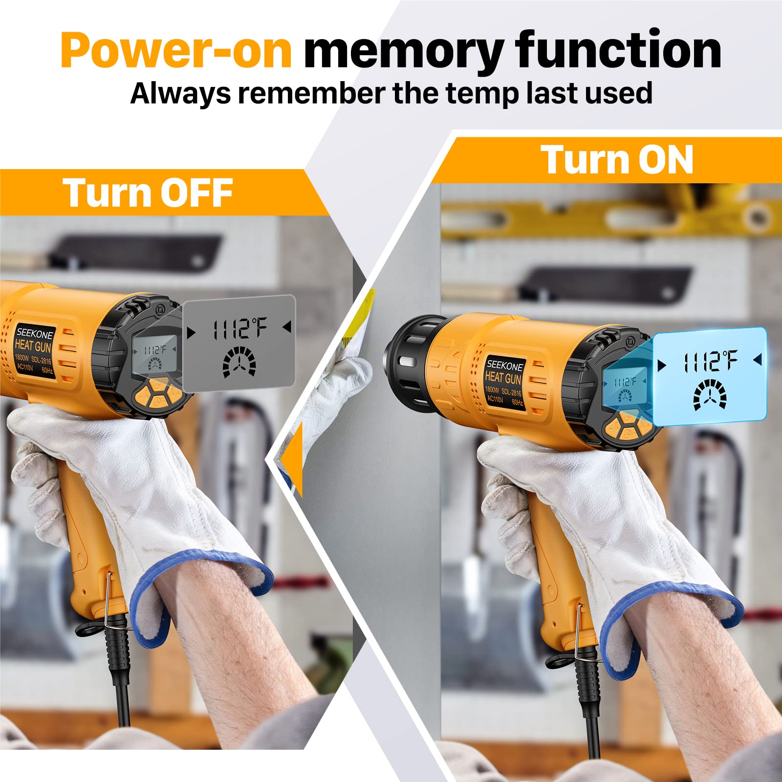 - 【Large LCD Display & Power-On Memory】 SEEKONE DIY heat gun digital control with Large LCD Display, you can adjust the air volume and temperature precisely, the use temperature is clearly on the LCD display. Our heat gun built-in power-on memory function, it will continue working on last set TEMP & SPEED, no need to resetting again. This is the first one heat gun can change ℃ to ℉, please press the 2 wind speed button in same time for few seconds to set the conversion between Celsius and Fahrenhe