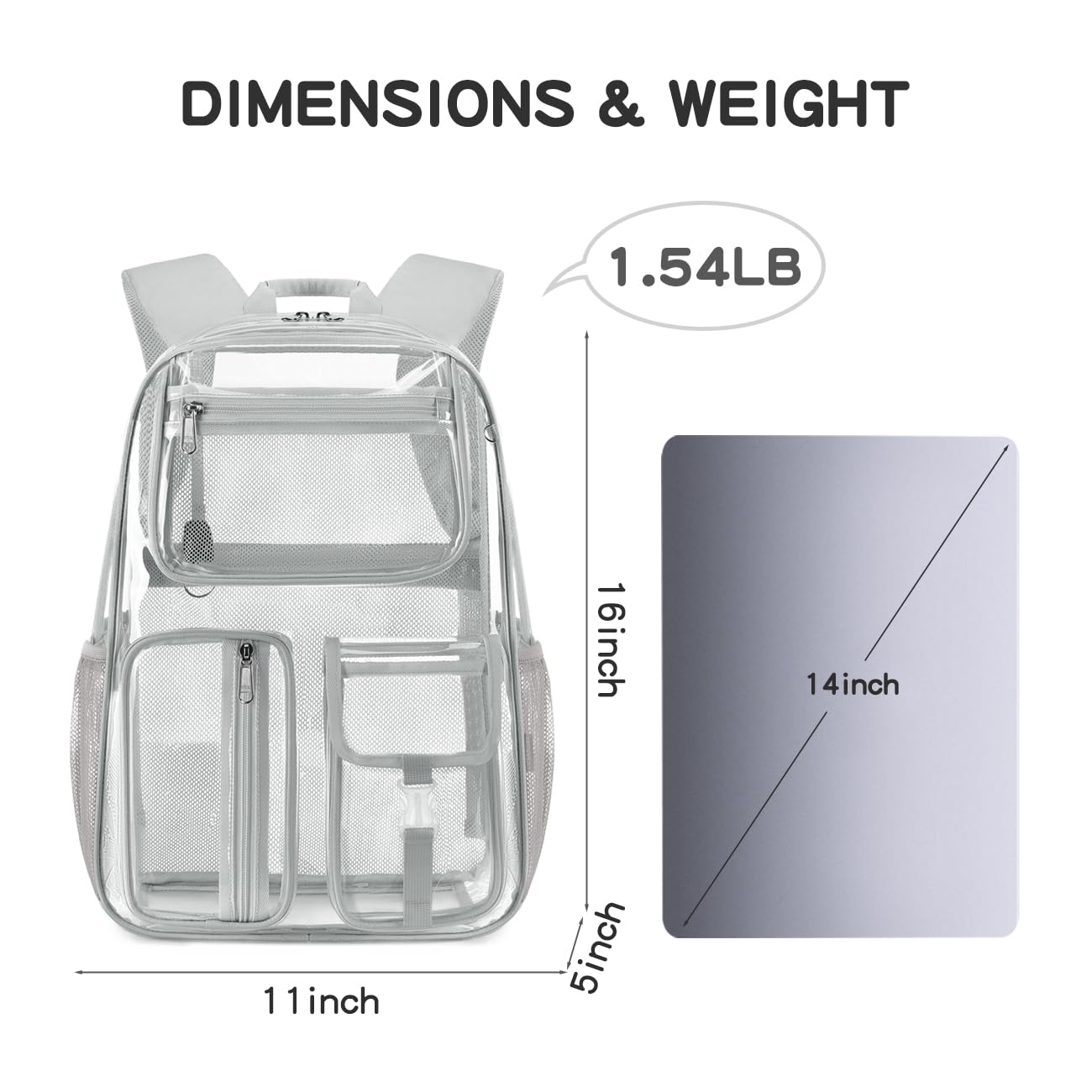 - Versatile, Spacious -- See through backpack is spacious, measuring 16 x 11 x 5 inches (H x L x W). It has a transparent design for easy access to your essentials. The main compartment has a double SBS zip and there are two additional front compartments and two side mesh pouches. It offers plenty of room for items like binders, laptops, books, pens, and water bottles.