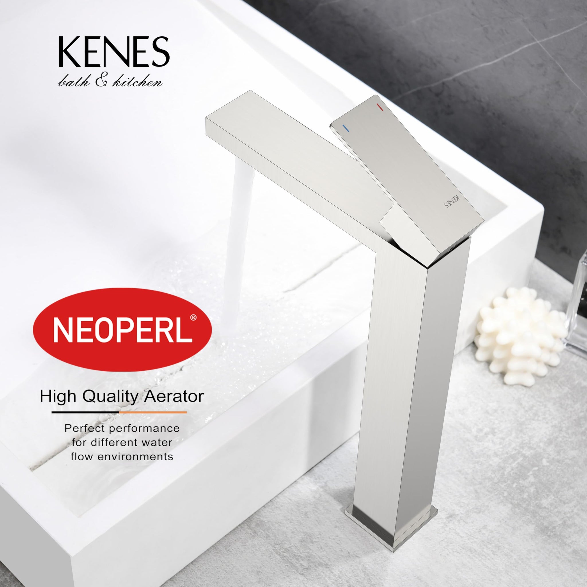 - IMPORTED NEOPERL BUBBLER - Aerated air flow, no splashing, minimum noise, producing a larger, whiter flow, soft touch and no splashing. You can remove the inflator and clean the mesh. KENES faucets have been 100% tested with pressurized water before leaving the factory. Flow Rate: 4.5L/min (1.2gpm) at 410 kPa