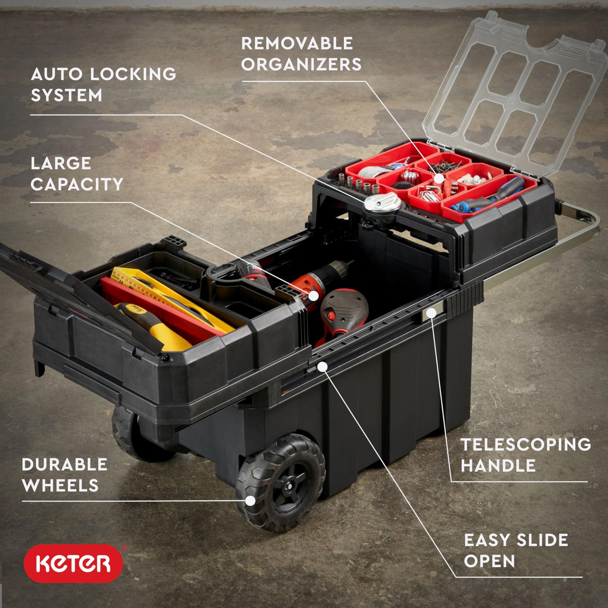 Details: This plastic tool box is like a portable shop. It has a central locking mechanism for maintaining security as well as stability during travel. The interior is organized to maximize the amount of available space, and there is even a tool divider for the easy compartmentalization of your tools. The topmost bins slide apart to reveal the main bin underneath, and this system allows users to store their most useful tools on the top portion of the tool box. Heavy tools and rarely used items can easily be stored below. The ball-bearing sliders allow you to gain access to these tools without the cumbersome added step of removing the top bins.