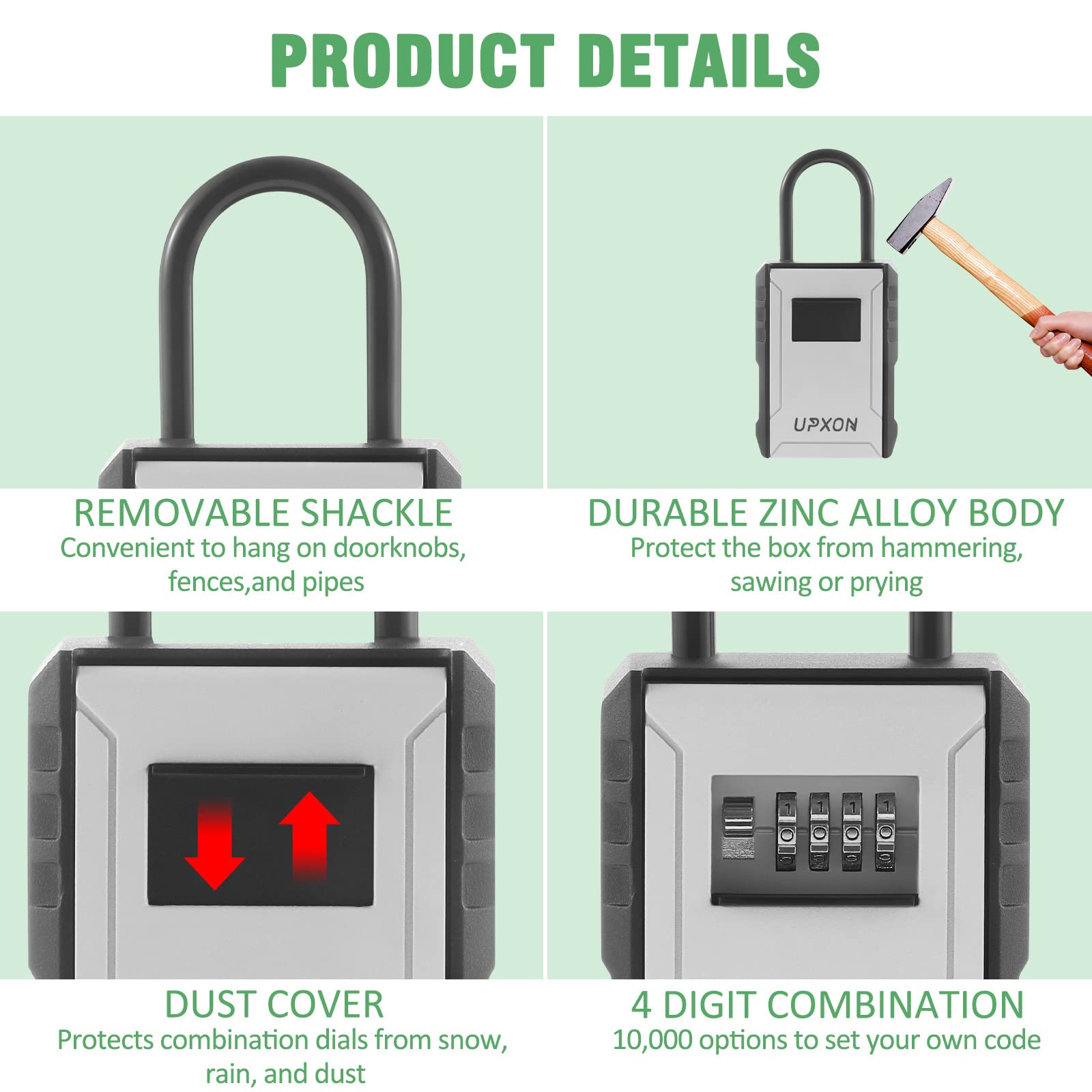 - 【Durable & Sturdy】The key lock box is made of aluminum, zinc alloy, and heavy-duty steel, which makes this key lock box much durable and sturdy, can protect the box from hammering, sawing, or prying. No need to hide a key under the carpet, the vase, or under a stone anymore.