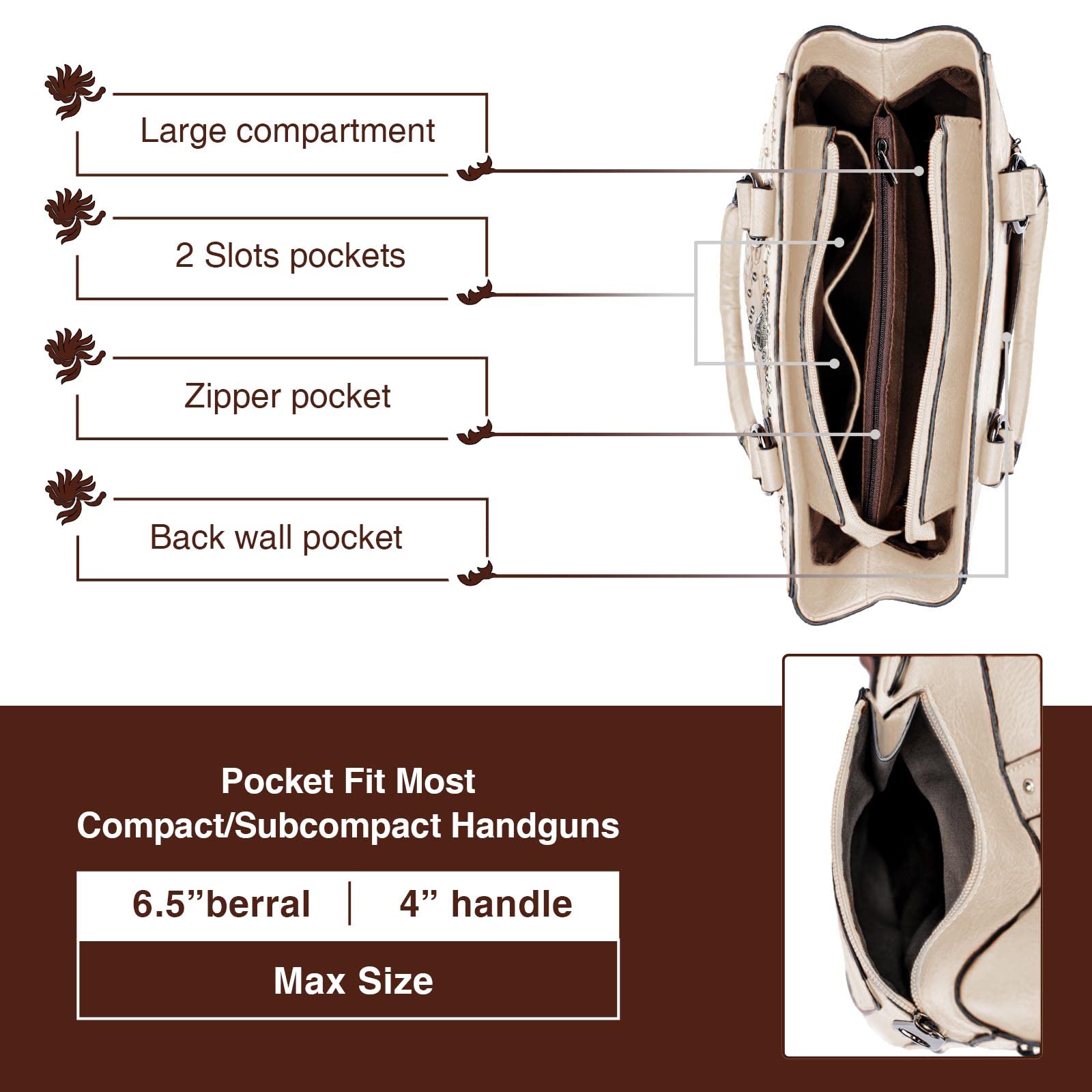 - 💝💝【Exterior Details】: This western purse accented with embossed flower pattern and silver studs concho, metal feet at the bottom for protection and stability, and with two comfortable handles. keeps all you items neat and tidy with center zipper pocket/divider. Designed with customers in mind. 2 large card slots inside can store personal items.Back open pocket makes it easy to find keys when you need them.