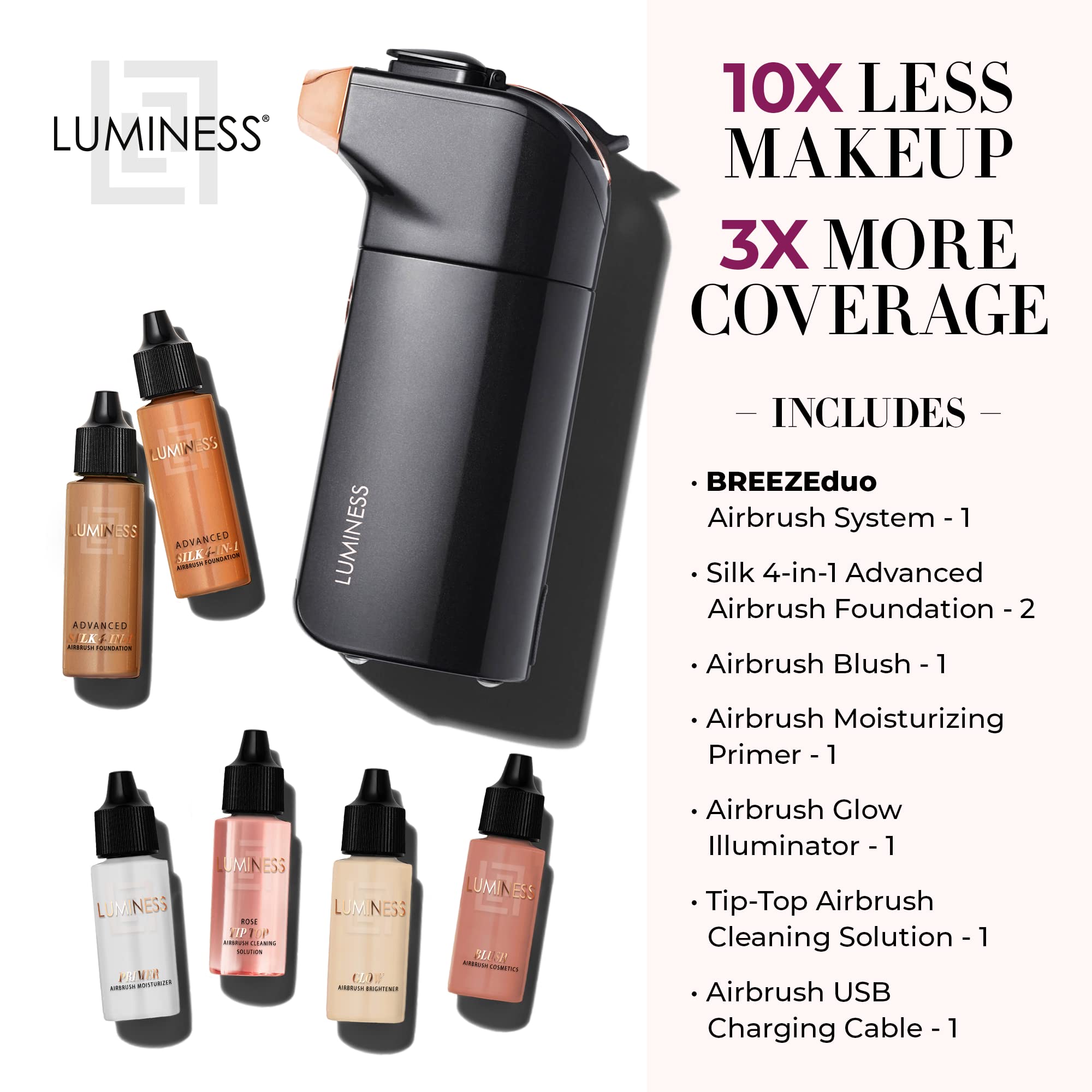 - 10X Less Makeup, 3X More Coverage: The LUMINESS BREEZE Duo is a super convenient way to quickly & easily conceal fine lines, wrinkles, and imperfections. It applies makeup & skincare in an ultra-fine mist to transform your skin. Includes 1 BREEZE Duo Device, charger, a 0.5-oz Silk Advanced Foundation Shade 9, a 0.5-oz Silk Advanced Foundation Shade 10, a 0.25-oz Apricot Blush, a 0.25-oz Glow Highlighter, a 0.25-oz Moisturizer Primer, and a 0.25-oz Tip-Top Airbrush Cleaning Solution.
