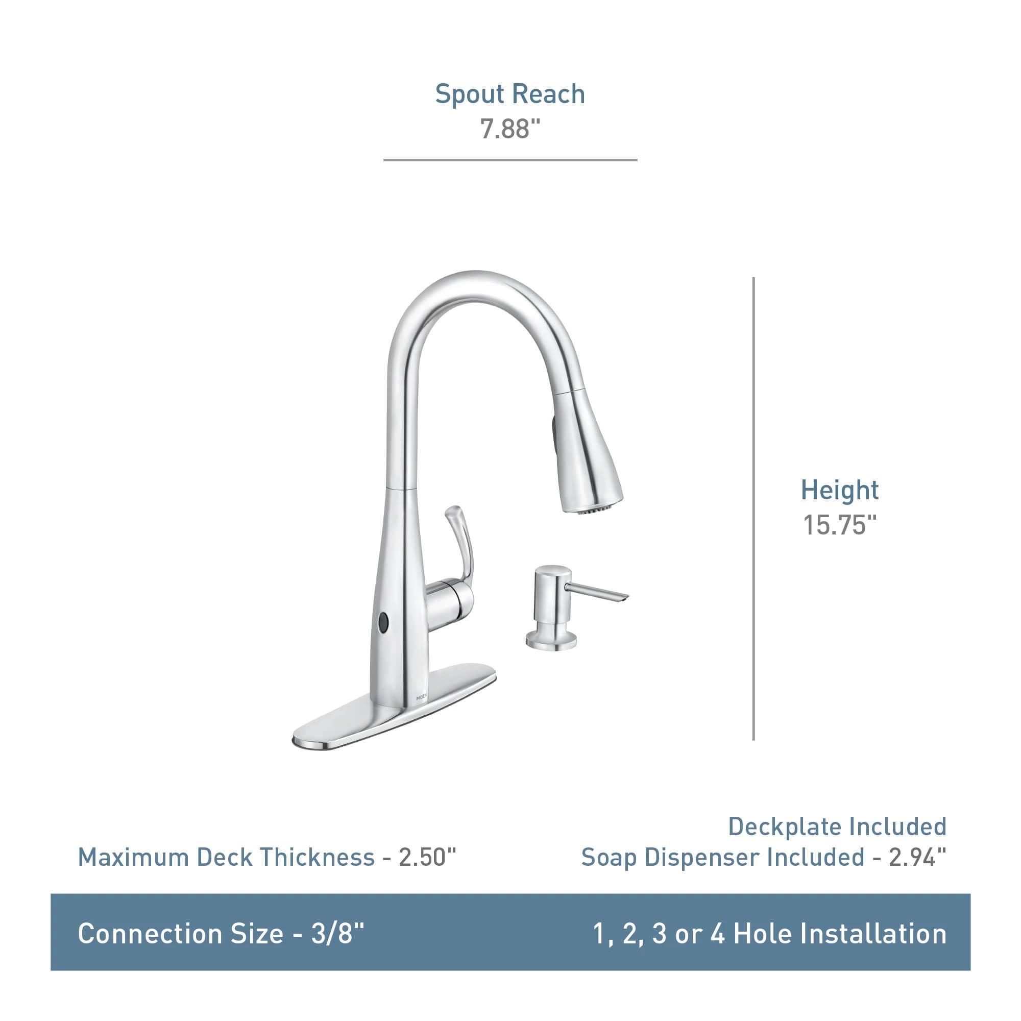 Details: The Moen Essie MotionSense Wave One-Handle Touchless Kitchen Faucet with Pull Down Sprayer and Soap Dispenser redefines convenience in the kitchen, combining a Wave Sensor for hands-free water control with a traditional lever handle for familiar manual operation. The high arc spout and Reflex pulldown system ensure ease of movement and secure docking, while the 68-inch braided hose provides extended reach. Equipped with Moen’s innovative Power Clean technology, the Essie faucet provides 50% more spray power, tackling heavy-duty messes quickly and efficiently.