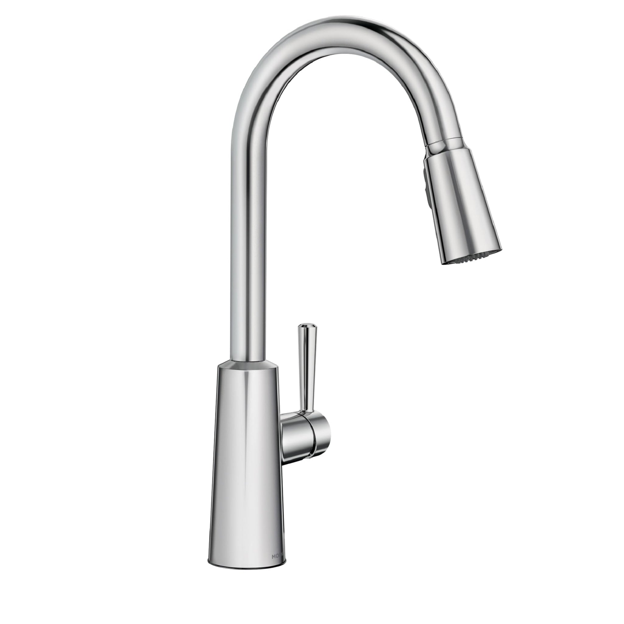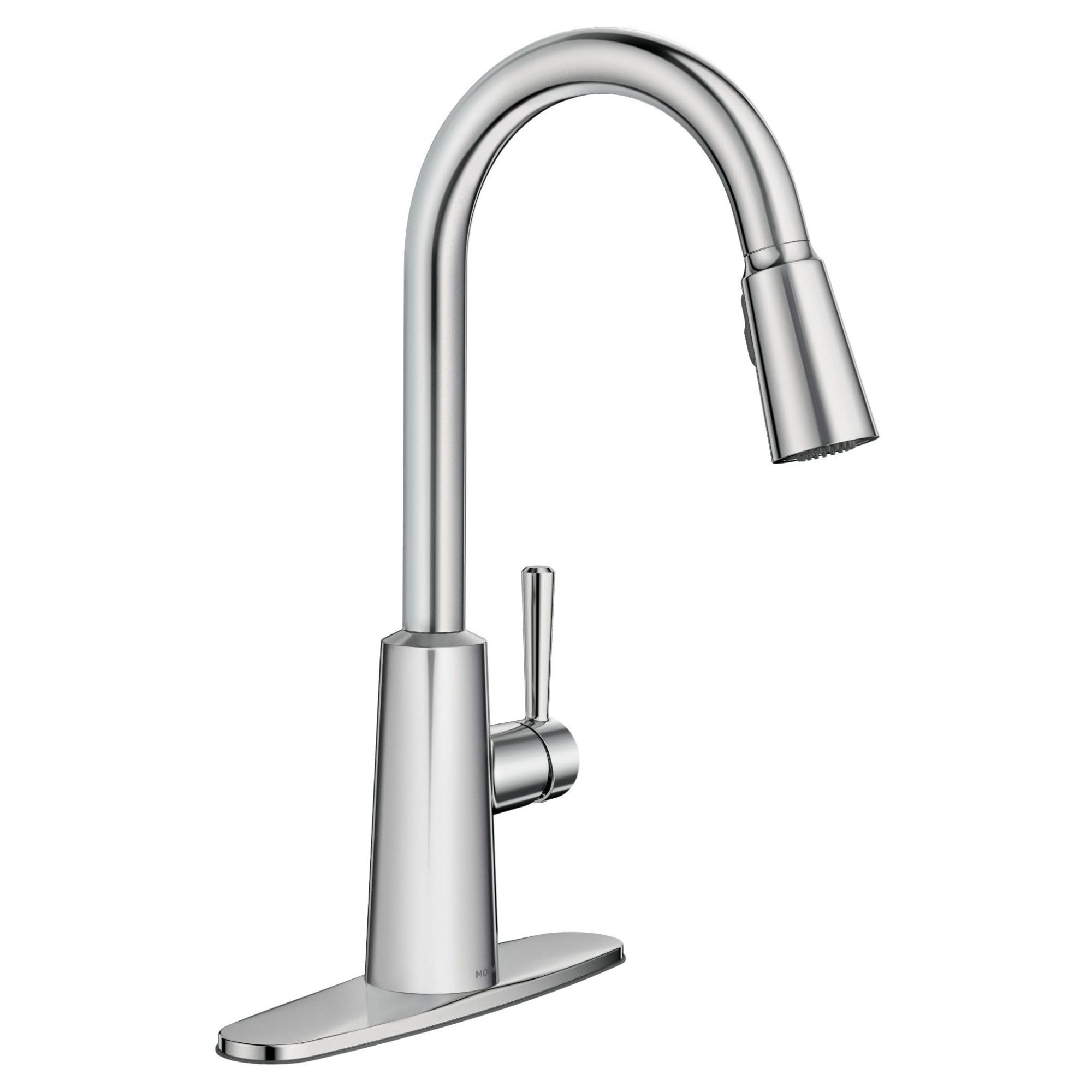 Details: Sleek lines and a clean, conical architecture make the Riley Pulldown Kitchen Faucet a standout in any Modern kitchen. The convenient pulldown spray wand features the Moen Reflex system for smooth operation and easy maneuverability. Change from a standard aerated flow to Power Boost mode for a faster clean with the push of a button on the spray head. The Moen Riley Pulldown Kitchen Faucet can be installed in sinks with 1 or 3 holes. The standard kitchen faucet design easily installs on a sink or countertop with the Moen Duralock quick-connect system. It comes with an optional Escutcheon (Deck Plate).