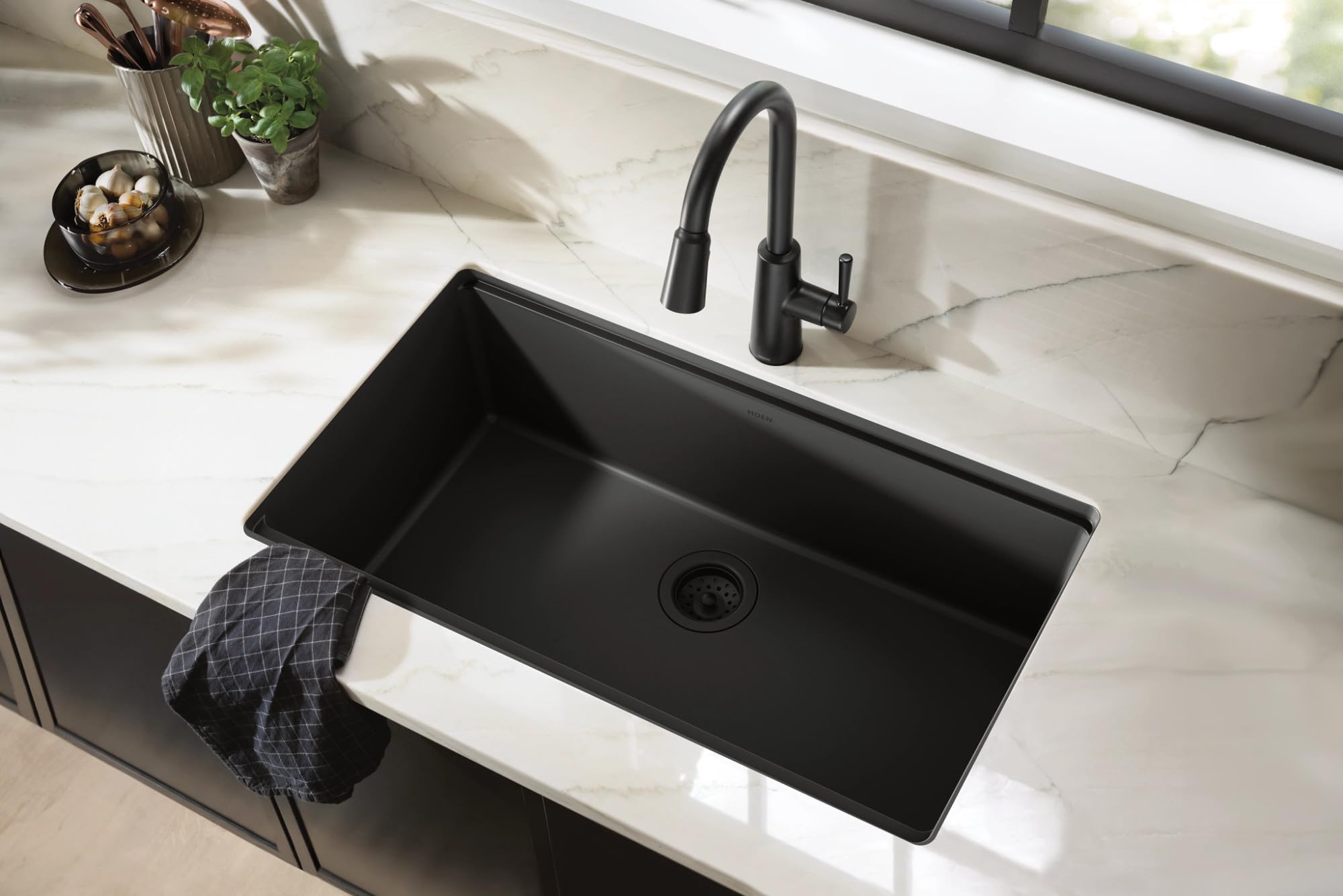 Details: Sleek lines and a clean, conical architecture make the Riley Pulldown Kitchen Faucet a standout in any Modern kitchen. The convenient pulldown spray wand features the Moen Reflex system for smooth operation and easy maneuverability. Change from a standard aerated flow to Power Boost mode for a faster clean with the push of a button on the spray head. The Moen Riley Pulldown Kitchen Faucet can be installed in sinks with 1 or 3 holes. The standard kitchen faucet design easily installs on a sink or countertop with the Moen Duralock quick-connect system. It comes with an optional Escutcheon (Deck Plate).