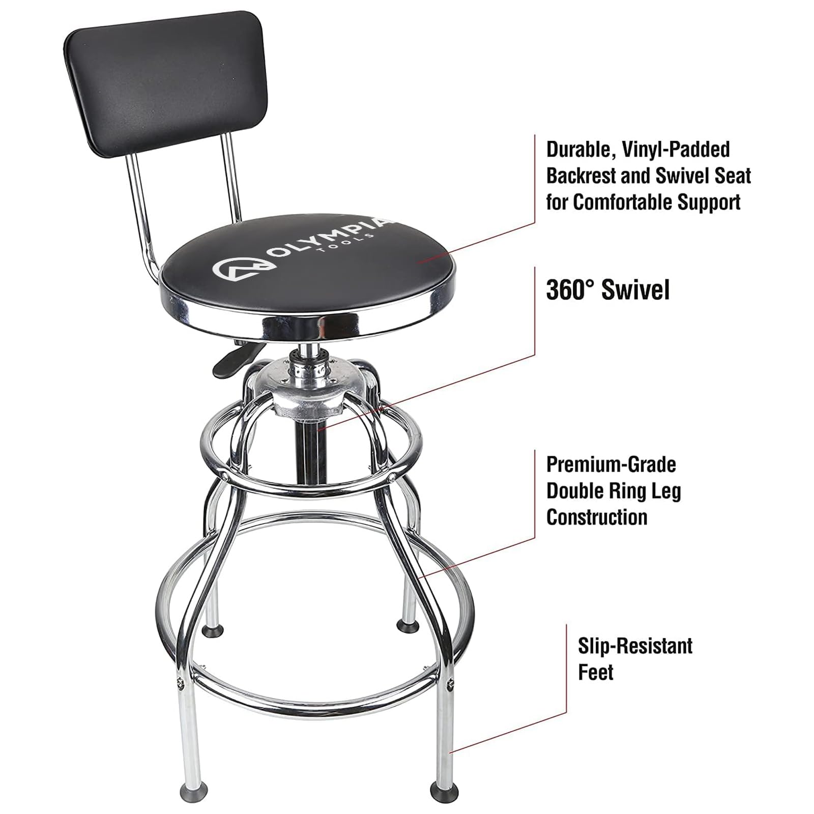 Details: The tough vinyl padding is Stain- and spill-resistant so your seat wipes clean easily and is always looking great. The adjustable, high-traction feet give you a stable base, while the foot rests provide added strength and a comfy place to rest your legs. A high-polish chrome finish helps to extend the life of your seat by resisting rust and corrosion. Padded vinyl seat features a backrest for comfort stool rotates 360 for maximum flexibility sturdy top and bottom rings encircle the frame for durability slip resistant fee