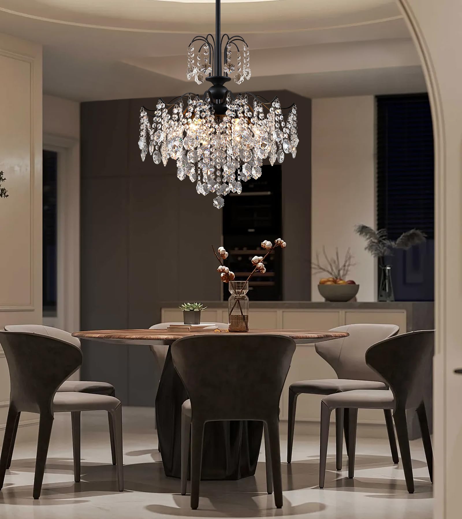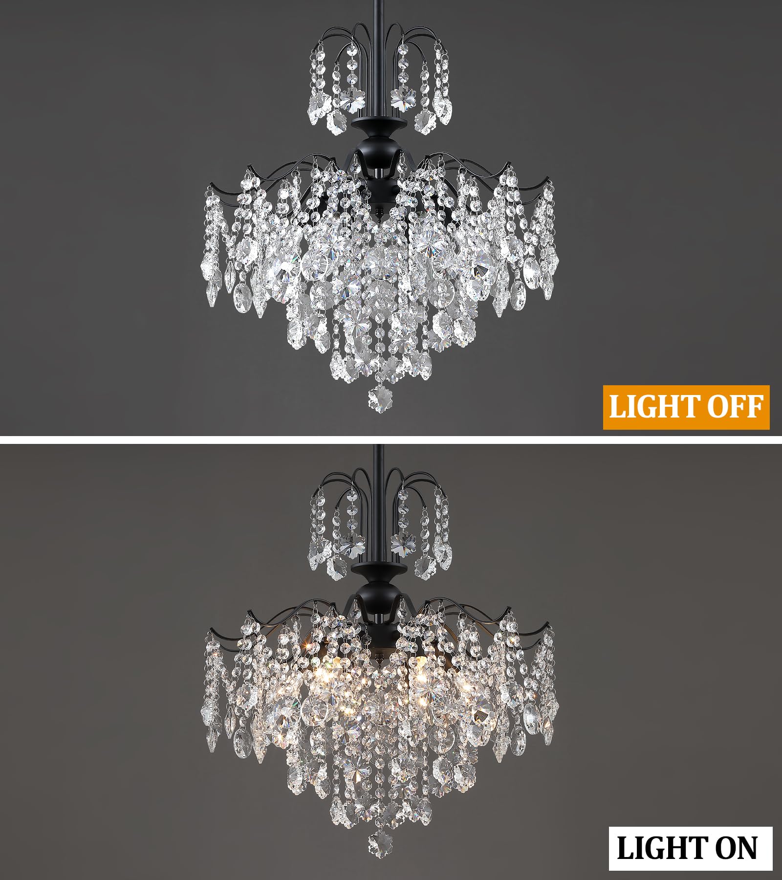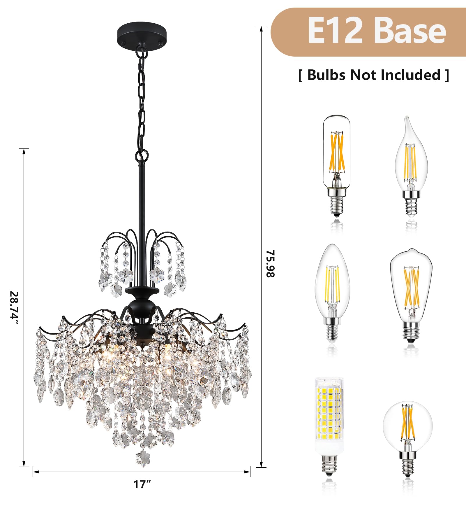 - Versatile Lighting Solution:Black chandelier with dimensions of D17 IN x H28.74 IN also crystal pendant light with 47.3 IN chain and 6 E12 bulb sockets,this black crystal chandelier is compatible with various E12 bulb types(LED,halogen,dimmble bulbs),bulbs not included.Allowing you to customize the brightness and ambiance of any room.Featuring an adjustable hanging chain,this crystal pendant light can be easily tailored to suit the height and space requirements of your dining room,bedroom,bathroom,or living room.