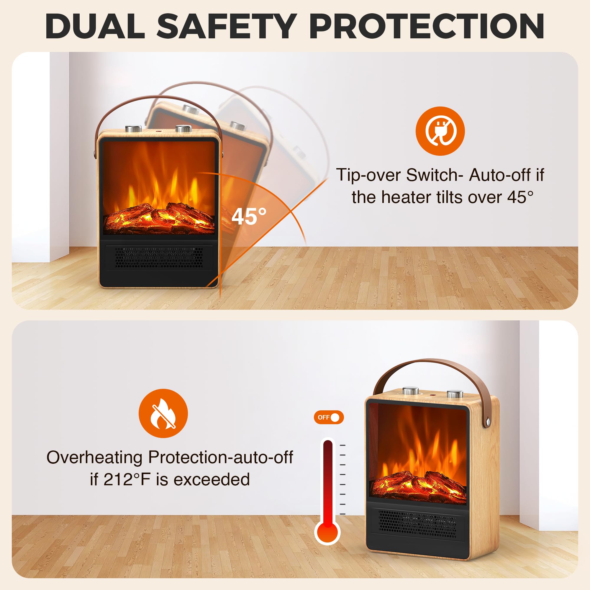- Double Safety Protection: Sensitive tip-over switch ensures that the mini fireplace heater auto shuts off if it's accidentally knocked over. Built-in overheat protection sensor auto shuts the portable heater off when the internal heat reaches 212°F or above to prevent potential hazards.
