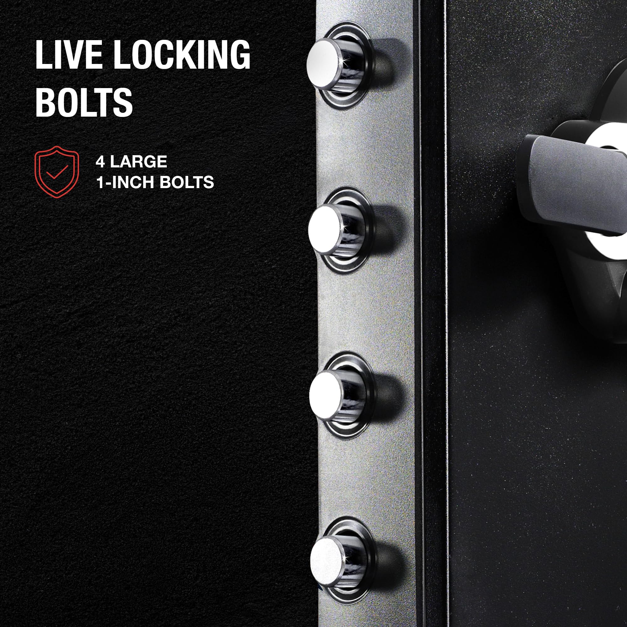 - MAXIMUM SECURITY: Combination safe features 4 live-locking bolts, steel construction, pry-resistant hinge bar, shelf, and bolt-down hardware