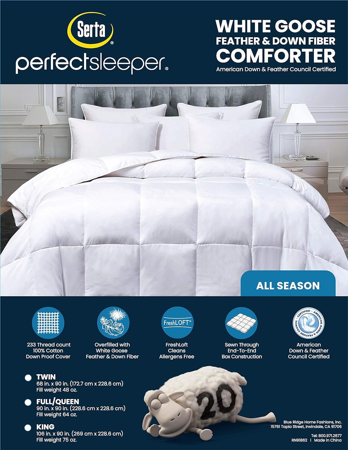 Details: This Serta white goose feather and down fiber comforter is the perfect solution for warmth and comfort. The unique fill gives you the look and feel of an all down filled comforter for a fraction of the cost. The all-season warmth fill weight is perfect for almost climate. You’ll love the look and feel of the 233-thread count, breathable 100% cotton cover. The end to end sewn through box quilting ensures that the white goose fiber doesn’t shift, so you’ll never have any cold spots on the bed.
