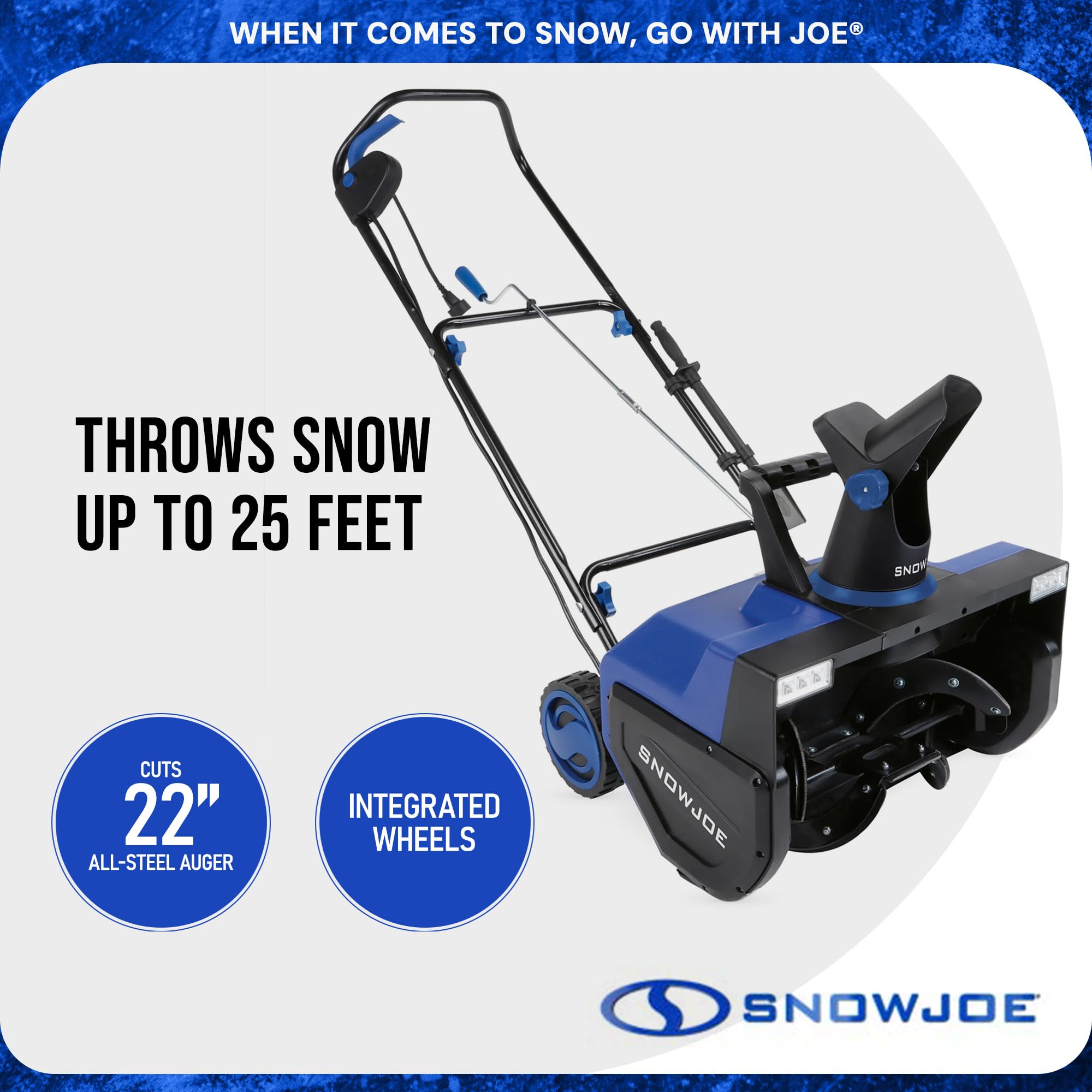 Details: MAX POWER + MAX PERFORMANCE! Our engineers have maxed out this model with the most power and widest clearing width for best-in-class performance in an electric unit. Snow Joe’s enviroment friendly SJ627E snow thrower combines the power of gas with the performance of an electric for unlimited snow-shredding power. The 15-amp unit is ideal for clearing large driveways and walkways without the hassle of gas, oil, tune-ups, frustrating pull-cords or tangled extension cords, and starts instantly and reliably with the push of a button. Simply plug in, squeeze the trigger - and go! Equipped with a steel auger and 4 heavy-duty rubber-tipped blades, SJ627E moves a massive amount of snow - up to an incredible 25 tons per hour - while clearing a path up to 22-inches wide by 13-inches deep in a single pass. SJ627E features an adjustable chute that rotates 180 degrees to direct the snow stream up to 25 feet away, and features a durable scraper bar at the base of the unit to clear to the ground without damaging your deck, driveway or pavement. Compared to heavier and more cumbersome gas machines, SJ627E weighs just 35 lbs, so you can easily maneuver it around your property, or carry it to clear snow from the deck. And for safer nighttime snow removal, SJ627E features dual integrated LED headlights to brighten the way for increased nighttime visibility. Tire Height- 7 inches.
