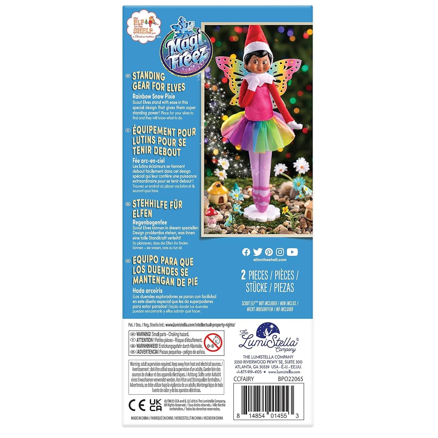 Details: Create magical holiday moments with the exclusive Elf on the Shelf MagiFreez Two-Piece Bundle! This delightful accessory set includes two enchanting outfits specially designed by Mrs. Claus to help your Scout Elf stand tall and spread cheer all season long. Featuring the MagiFreez Cocoa to Go and Rainbow Snow Pixie outfits, each piece adds its own festive flair with an easy-standing design and colorful accessories. Outfit #1: MagiFreez Cocoa to Go With Santa’s special magic, your Scout Elf can become the ultimate holiday barista! This accessory set features magical standing pants and a tray brimming with hot cocoa and donuts, perfect for spreading holiday cheer every day. Outfit #2: Rainbow Snow Pixie Let your Scout Elf take flight with a dash of rainbow magic! This outfit includes a sparkly, rainbow-colored dress, felt wings, and MagiFreez standing legs that give your elf the power to stand tall and shine all season long. Note: Scout Elf not included.