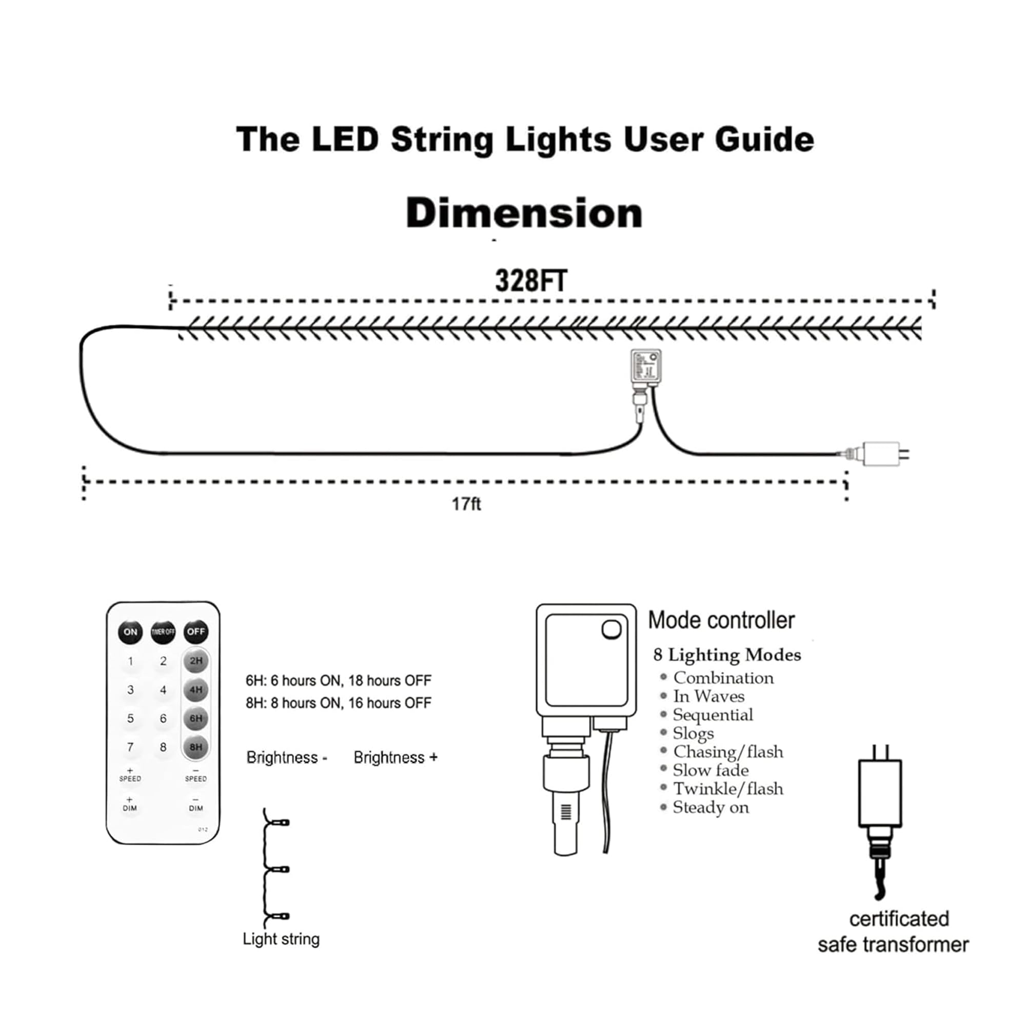 - Remote Control: The string lights come with a wireless remote control. It offers 8 modes including combination, in waves, sequential, slo-glo, chasing/flash, slow fade, twinkle/flash, and steady on. By pressing the "DIM" button adjusts the brightness. It features 4 timer modes, "2H" (2 hours on/22 hours off), "4H" (4 hours on/20 hours off), "6H" (6 hours on/18 hours off), and "8H" (8 hours on/16 hours off). The timer can be canceled by pressing "TIMER OFF".