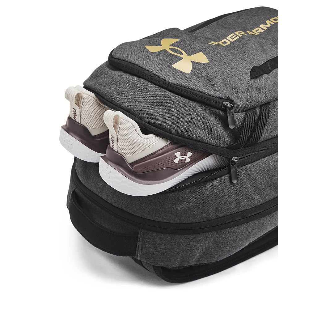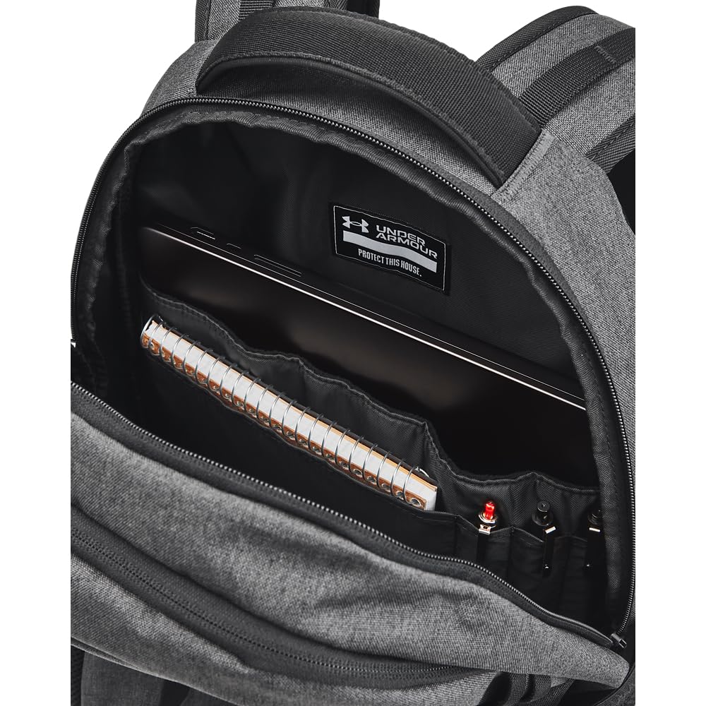This backpack does it all. It's water-repellent for the rain, tough as nails, comfortable as anything, and has all the pockets you need to hold all your stuff. Water-resistant UA Storm technology keeps your stuff dry. Soft-to-the-touch top coat on material for added durability. Secondary compartment can be dual-purposed as a shoe/laundry pocket. Secure zip front pocket for essential item storage & side water bottle pocket that fits 32oz bottle. Soft-lined laptop sleeve—holds up to 16" MacBook Pro® or similarly sized laptop. Molle webbing for additional attachment points. Top grab handle. . . . 100% Polyester.