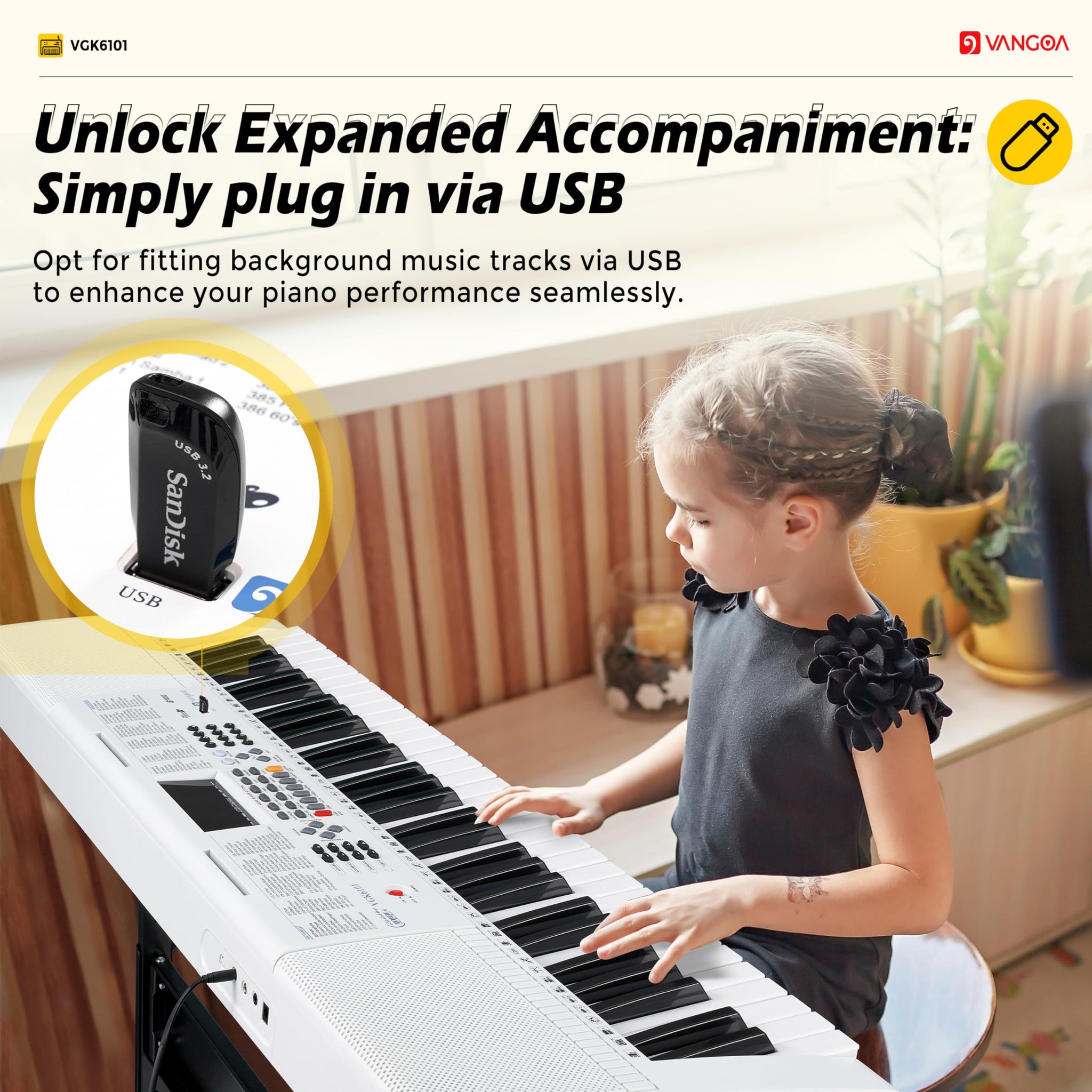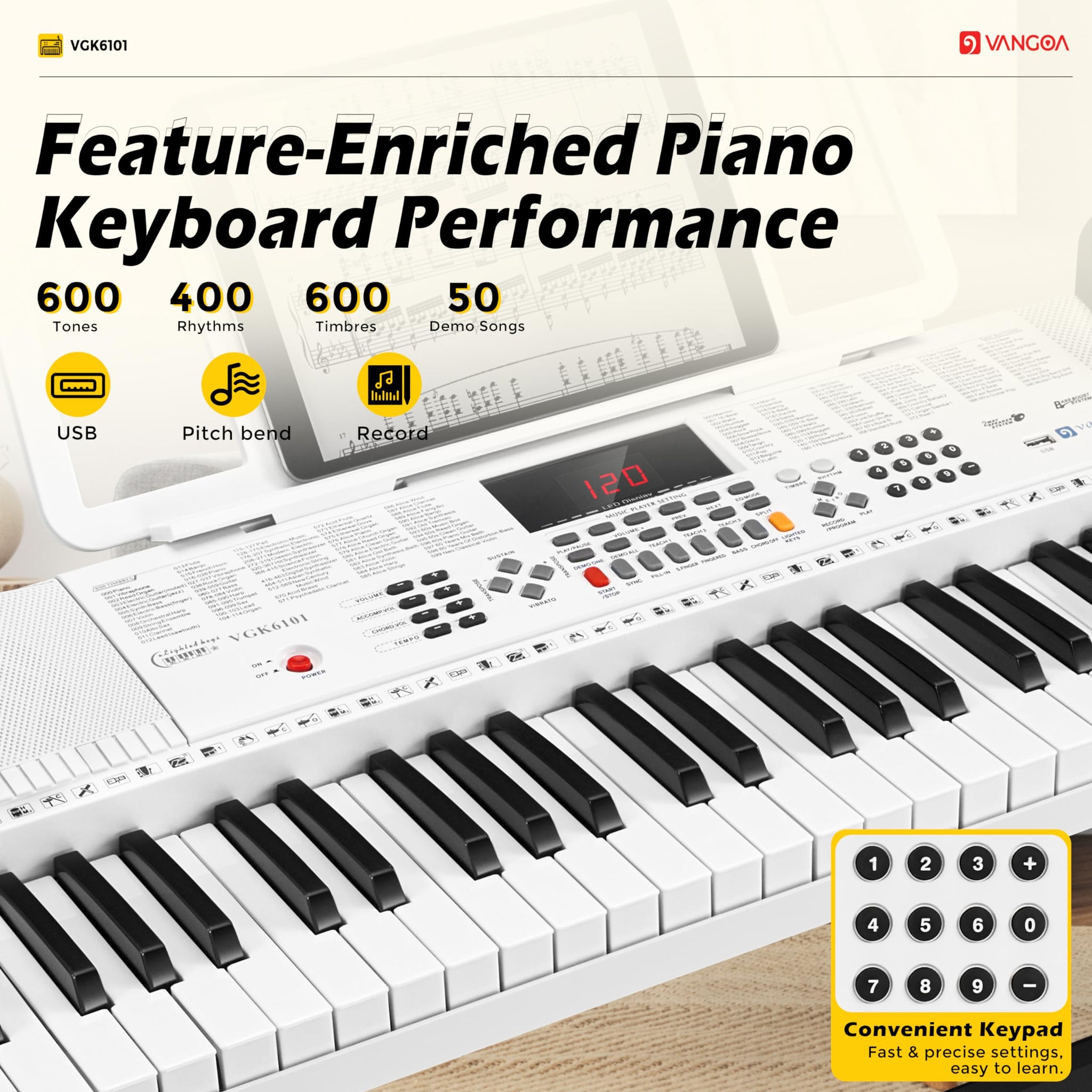 - ✅[Learning Piano Keyboard] Tailored key size for starter, learning piano keyboard features with A massive Sound Library with up to 600 timbres & rhythms, 50 demo songs, and 61 percussions cultivates kids' recognition of different musical instruments effortlessly. you can unleash your creativity and enjoy band performances