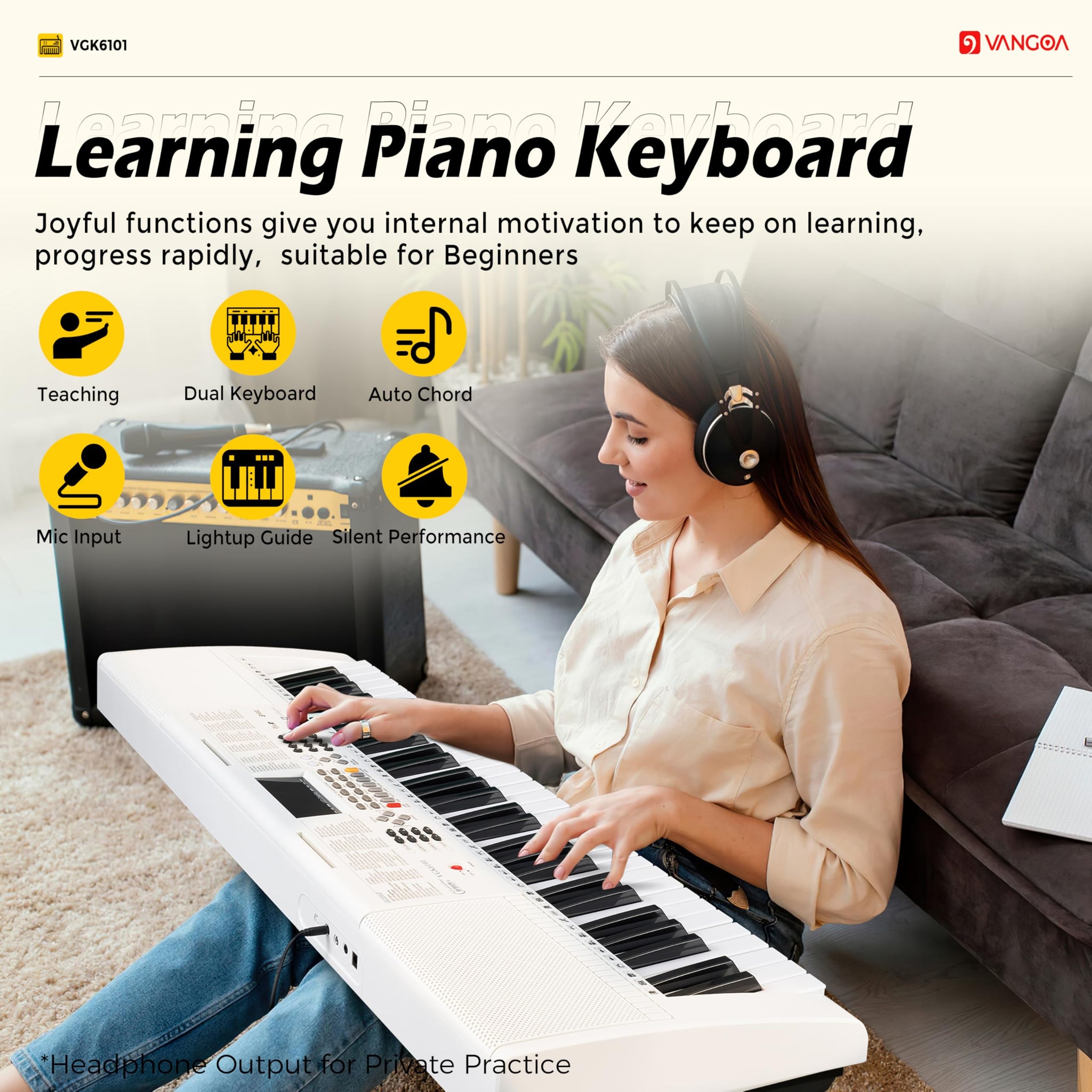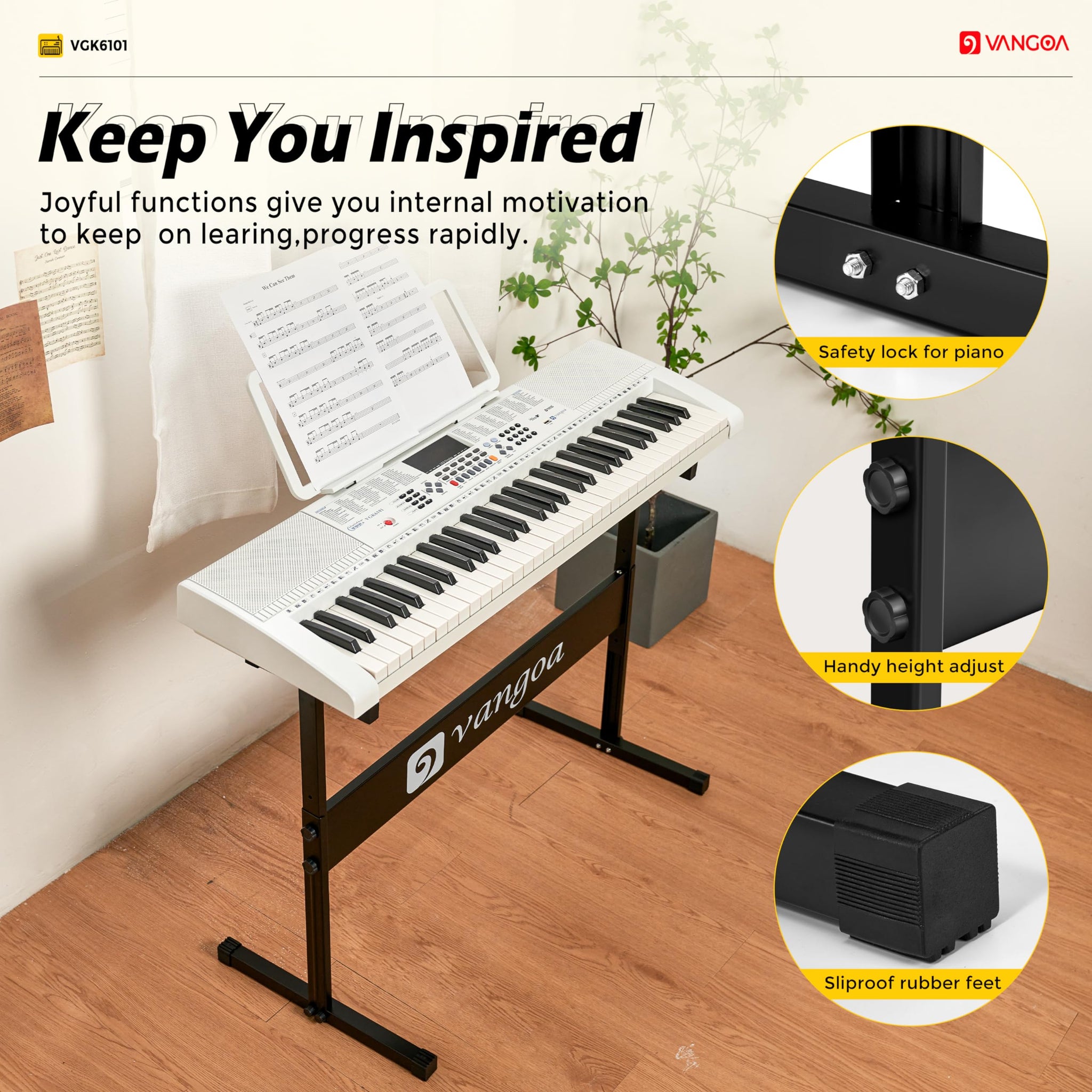 - ✅[Perfect for Beginners] 61-key keyboard piano features light-up keys and three intelligent teaching modes: One key, Follow, and Ensemble. Ideal for quickly improving performance skills, also as gift for kids, friends, and family. LED lighted keys and teaching modes offer a game-like practice experience, making learning fun from the start. Plus, it guides from beginner to advanced levels with demo note order, adjustable tempo, and step-by-step progression
