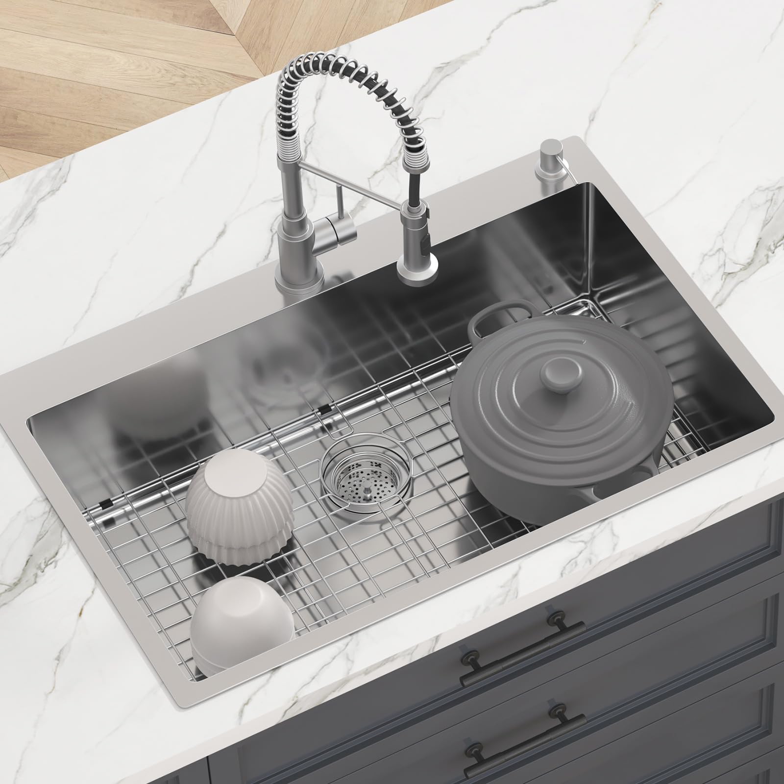 - What You Will Get: Stainless drop in kitchen sink, a multi-functional dish grid with rubber feet to prevent scratching, a deep drain basket keeps food from clogging the drain pipe and prevent water flow.