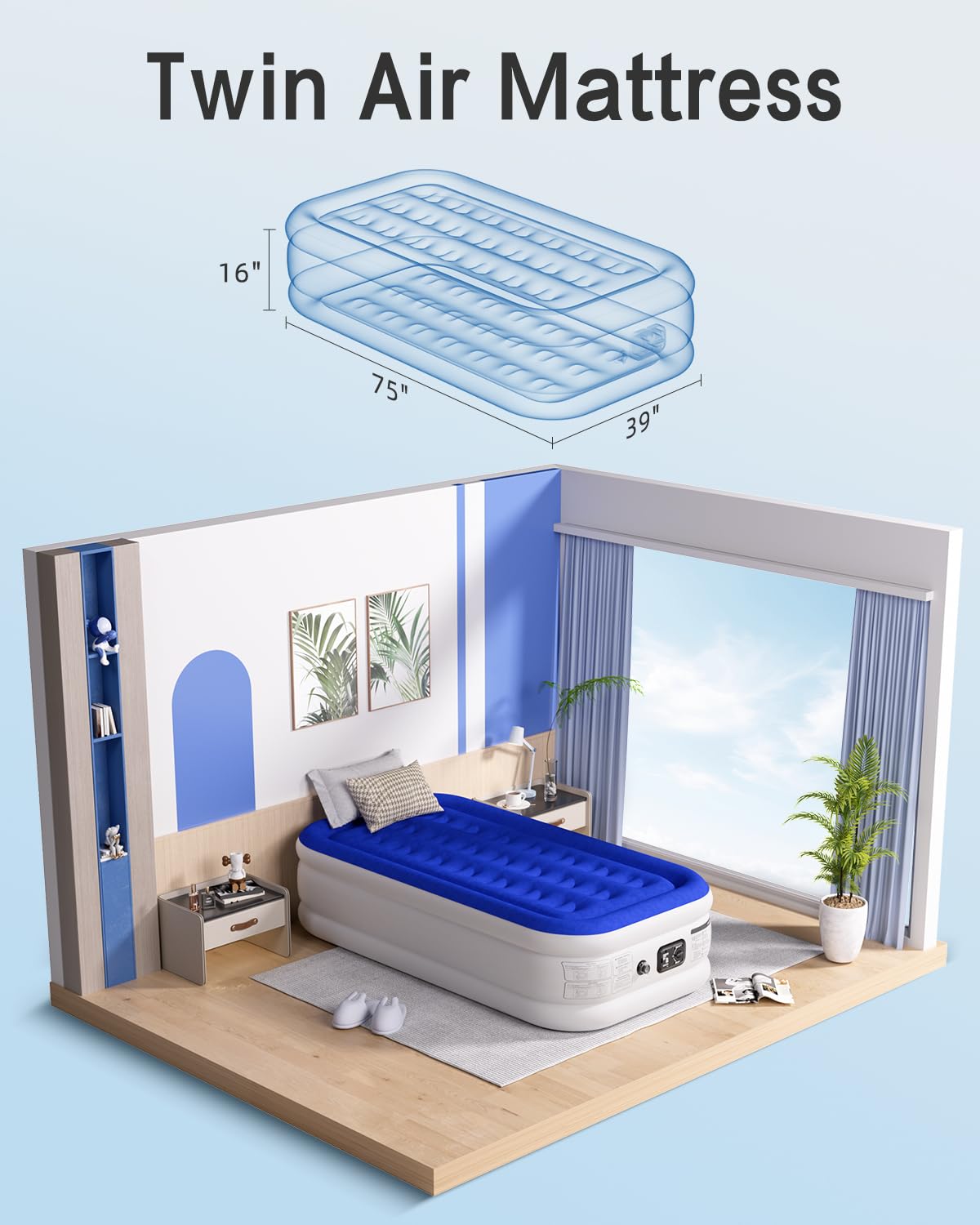 - UPGRADED AIR PUMP-75"*39"*16"twin blow up air mattress built in pump fast inflation/deflation in 2 minutes,30% Faster. Ideal for 2024 christmas gifts