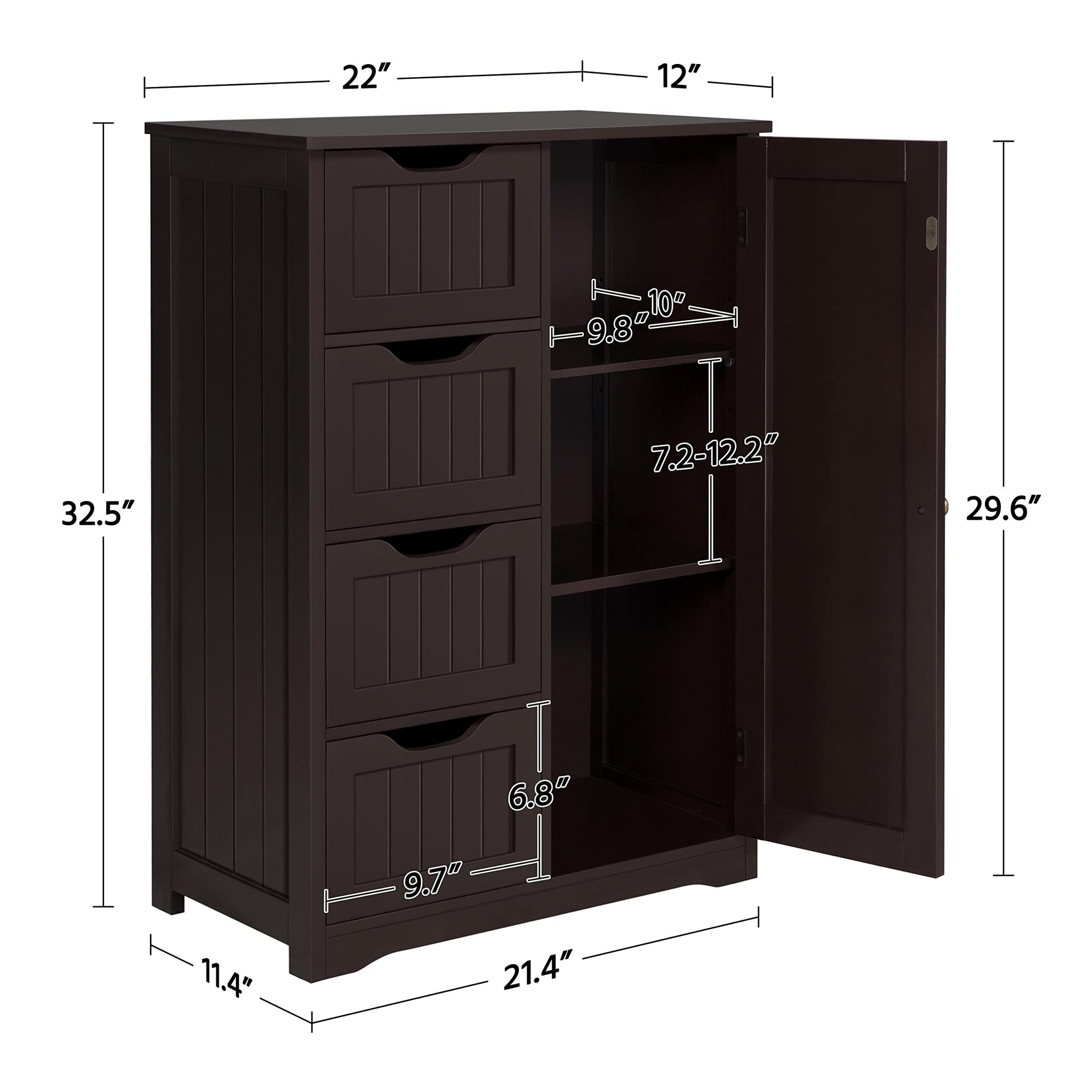 - Ideal space saver: Four drawers with cutout handles and one cupboard with a customizable shelf for you to organize different items like cosmetics, toiletries, towels, toilet paper, etc. A great option for tucking away bathroom clutter